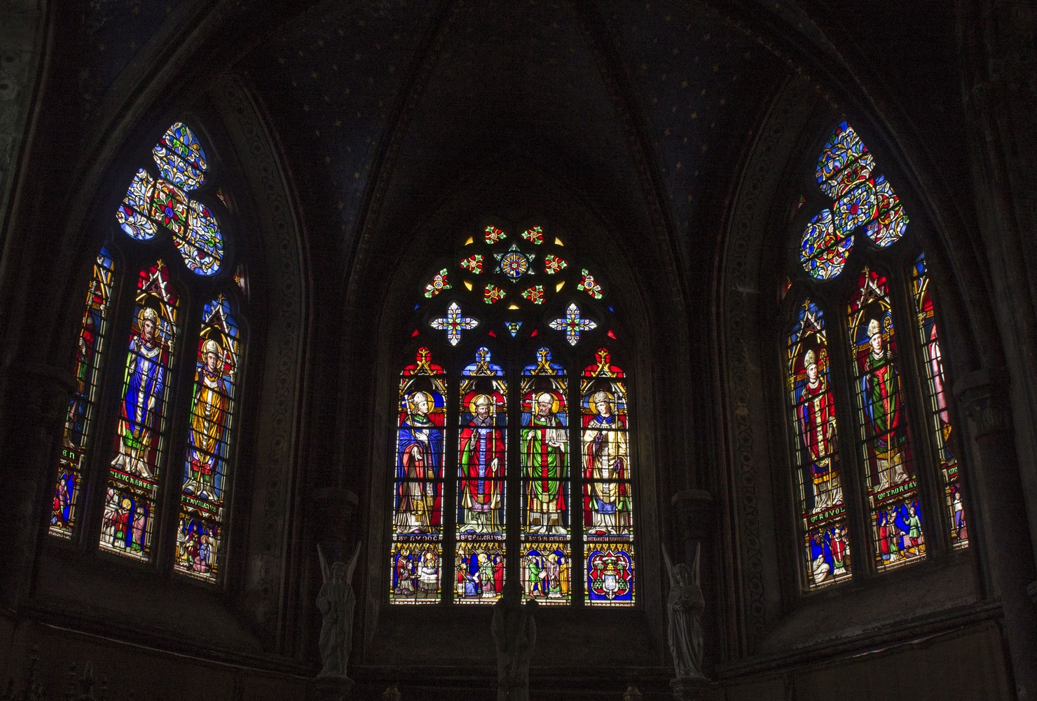 Vitraux de la chapelle axiale 🗎⮵ représentant dix évêques de l’évêché de Dol.