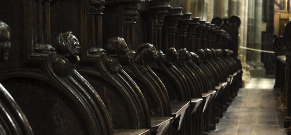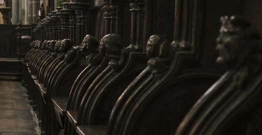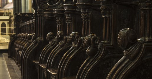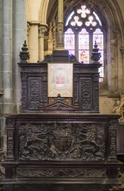 ⟴◆ Son chœur est habillé à chacun de ses côtés de 77 stalles établies en deux rangs avec leur appui-main sculpté pour la plupart d’une tête humaine. Près du maître autel repose l’ancienne cathèdre du XV aux armes de l’évêque de l’époque François de Laval.