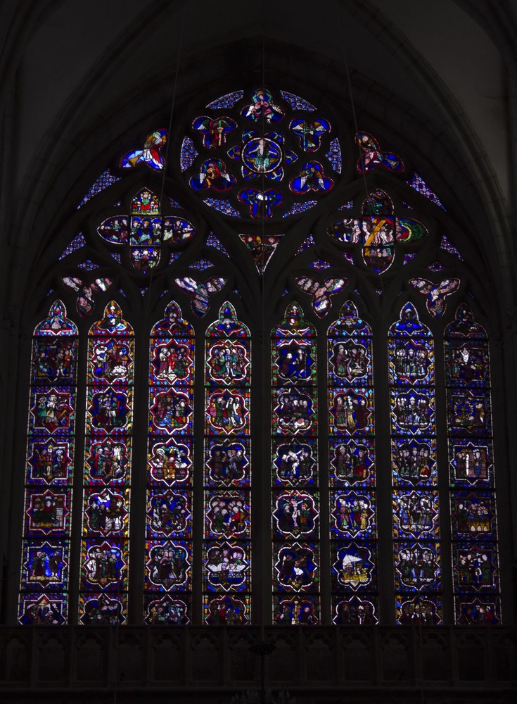 Maîtresse vitre du chœur de la fin du XIII maintes fois restauré, il raconte la vie de plusieurs saints dont Samson, Margueritte et Catherine.