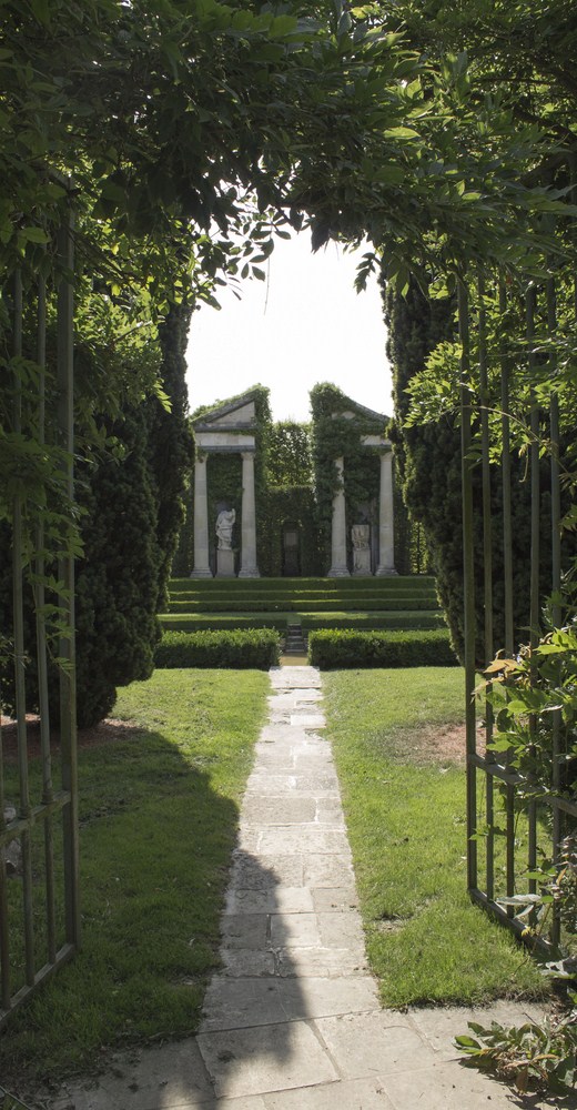 ◆ Le propriétaire actuel à aménagé les jardins de telle façon que le grand axe des nouveaux jardins puisse être considéré comme une évocation symbolique de sept degrés reliant l’univers matériel à l’univers spirituel (𝕍 plan interactif plus haut). Les axes auxiliaires évoquent quant à eux le fini et l’infini : l’intériorité pour celui de droite et l’extériorité pour celui de gauche. En outre, la thématique générale des jardins est inspirée par la mythologie grecque et le monde antique en général.