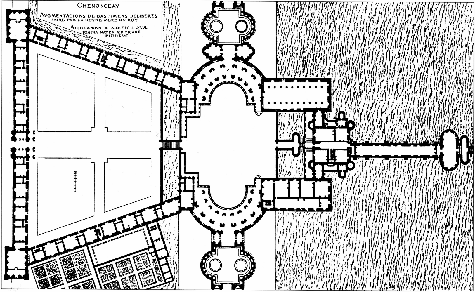 ⚐ 1561 – 1586 : Catherine fait elle aussi faire des jardins, plus petits que ceux de sa prédécesseuse, et agrandit le château malgré de désastreuses finances, faisant construire les galeries superposées sur le pont par Jean Bullant. Elle inaugure ce qui sert de salle de bal en 1577 en présence d’Henri III.