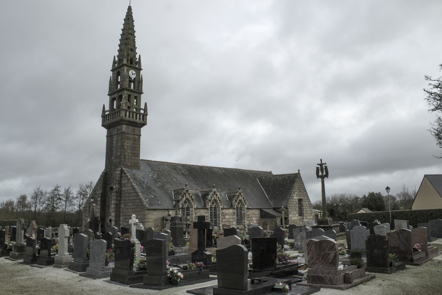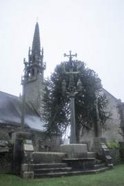 Côté sud de l’enclos paroissial Saint-Herbot avec son église et son calvaire.