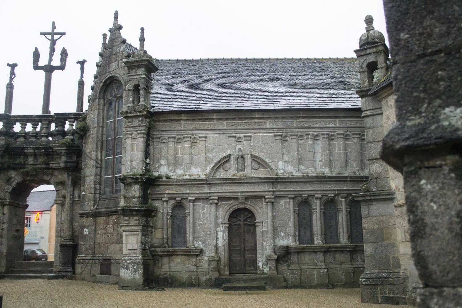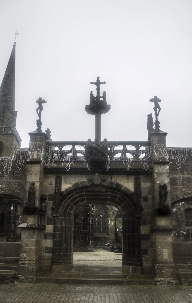 ► Le mur d’enceinte de l’enclos est ponctué par une porte triomphale de 1668 surmontée d’un Christ en croix entouré de la Vierge et de saint Jean. La cour englobe l’église Notre-Dame, un calvaire, une fontaine, une chapelle reliquaire, un ossuaire de 1667 et un cimetière. La tour relie l’église et l’ossuaire avec un passage à son socle.