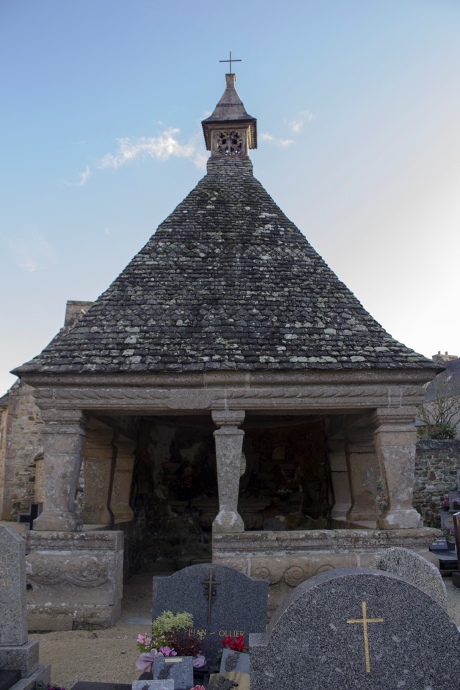 ◆ L’ossuaire daté de 1694 a été maintes fois remanié mais conserve toujours son inscription en breton sur la frise supportant le fronton : CHAPEL DA SA ITROP HA KARNEL DA LAKAT ESKERN AN POBL
