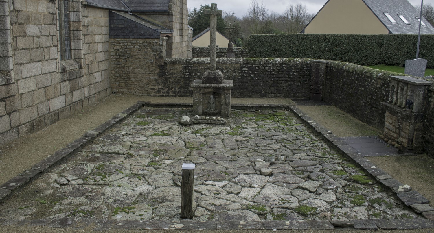 ◆ Le cimetière prenait auparavant la place de toute la cour, cernant le calvaire. La porte triomphale qui y donnait directement avait été par conséquent baptisée Porz ar Maro {Porte de la Mort}.