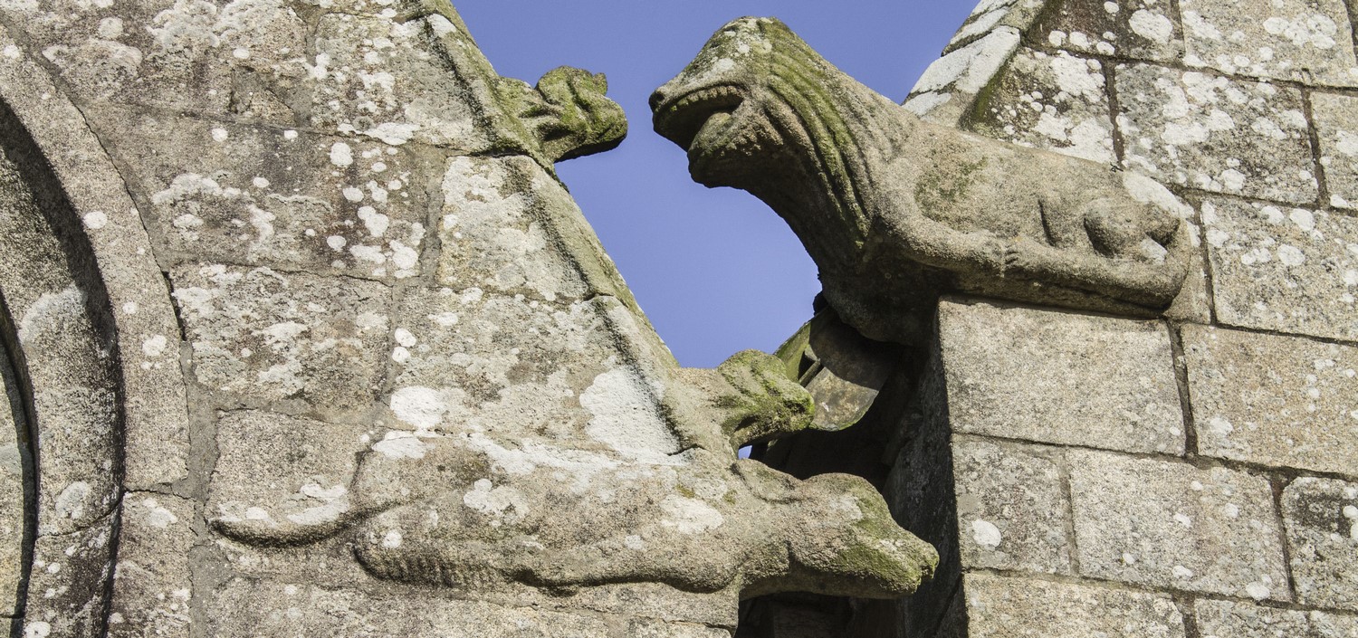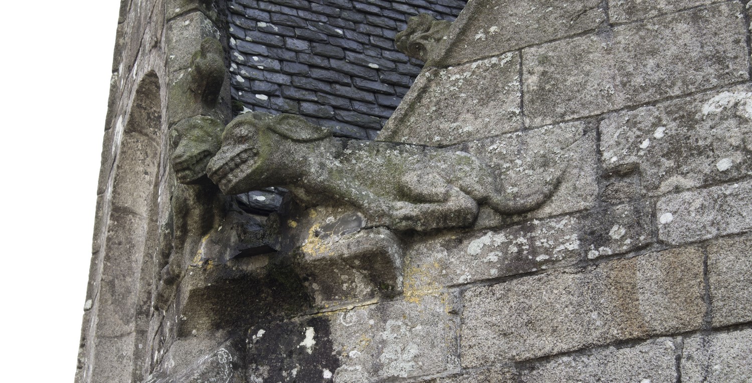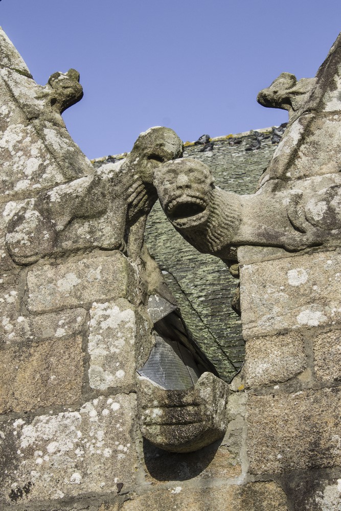 Détail de la tour avec ses gargouilles d’apparence démonique et aquatique.