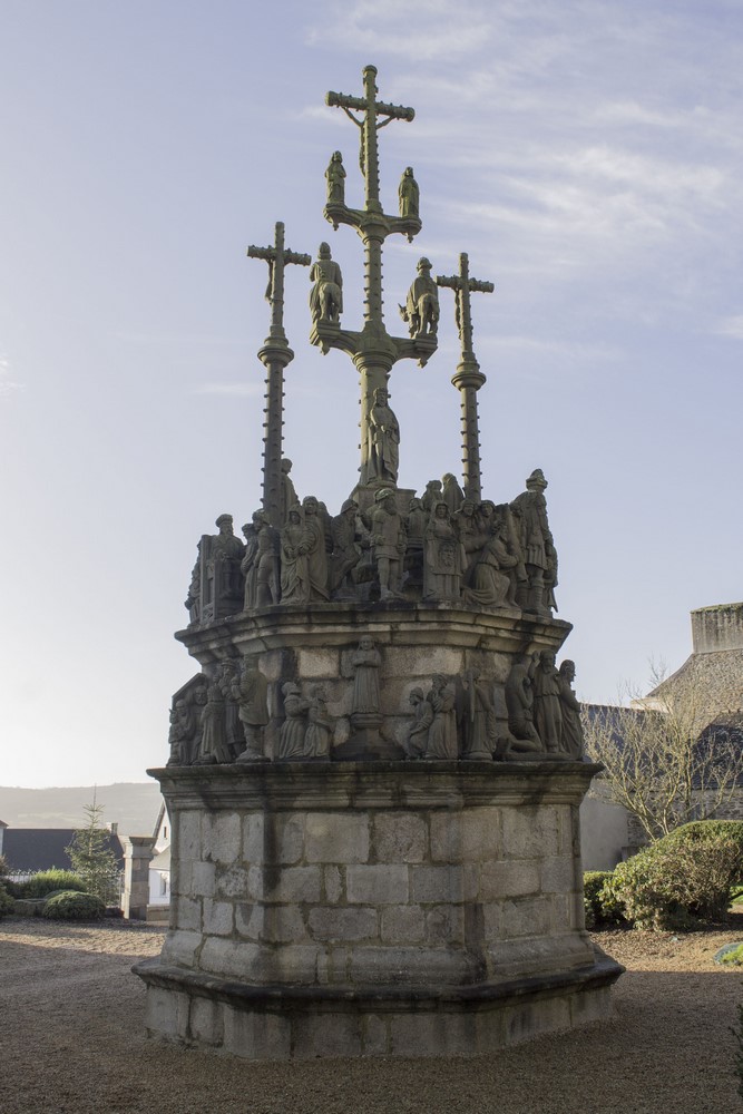 ◆ Le calvaire monumentale exécuté f.XVI fait partie des grands calvaires représentant les scènes de la vie du Christ, auquel on ajoute ici une représentation de l’histoire de Katel Kollet, une femme au mœurs dissolues se retrouvant aspirée par les portes de l’enfer après une danse endiablée.