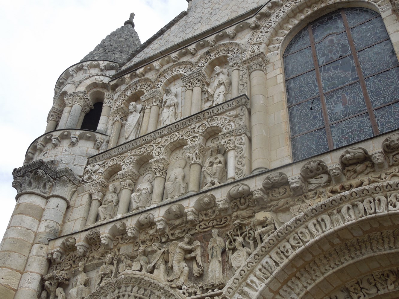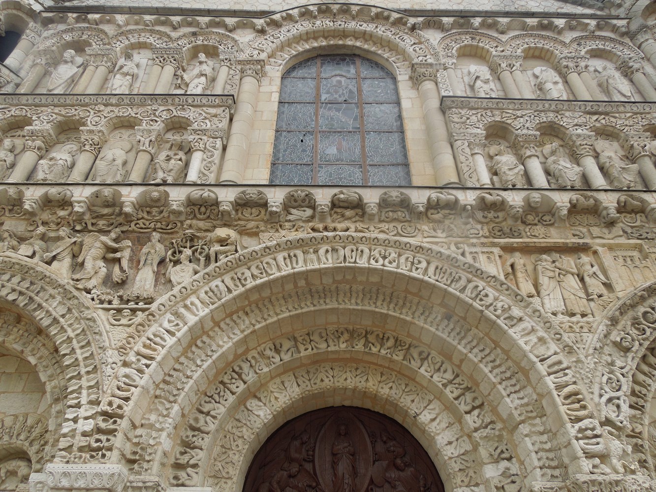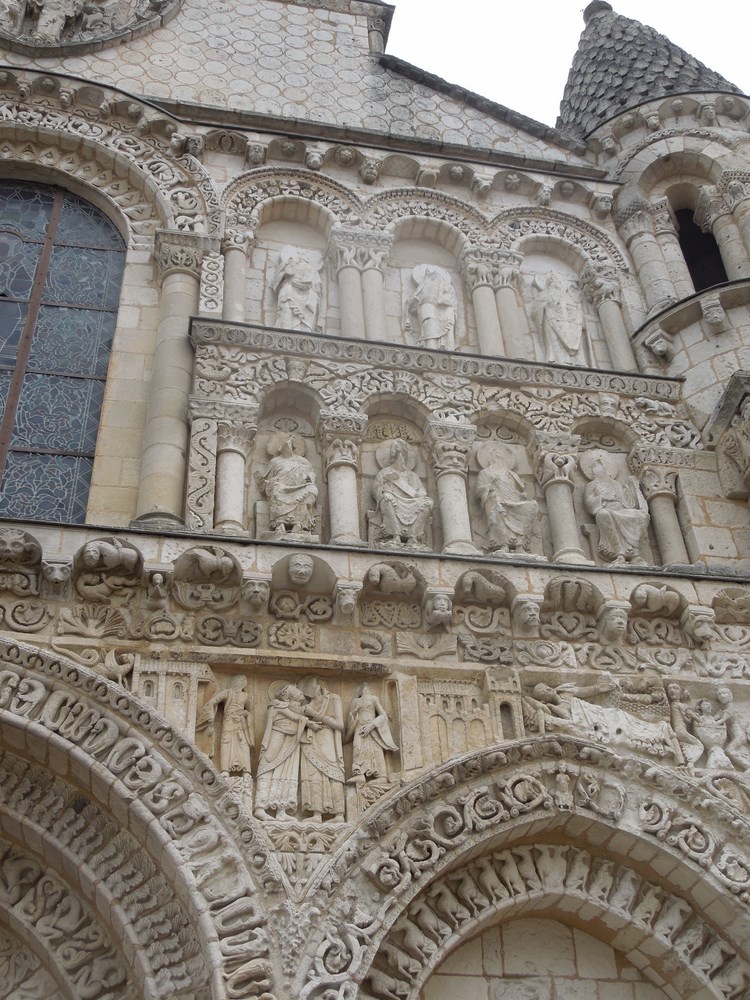 Détail des sculptures de la première et seconde élévation፧ de la façade, les galeries d’arcades nichent à la première des statues des apôtres et à la seconde, les quatre Évangélistes et ℙ les évêques Hilaire et Martin.