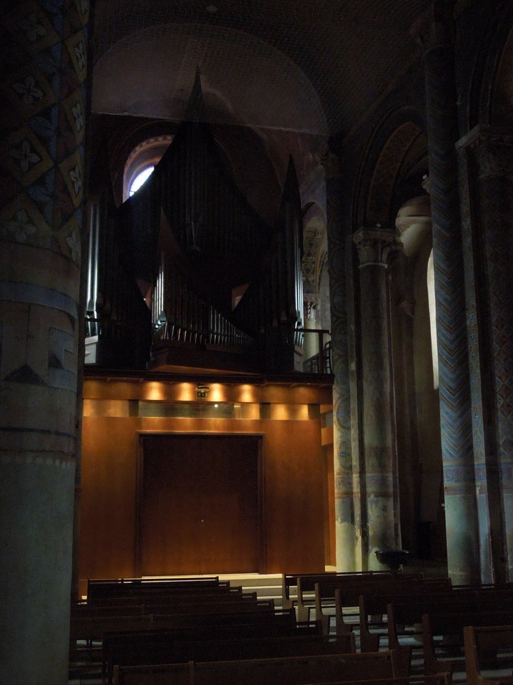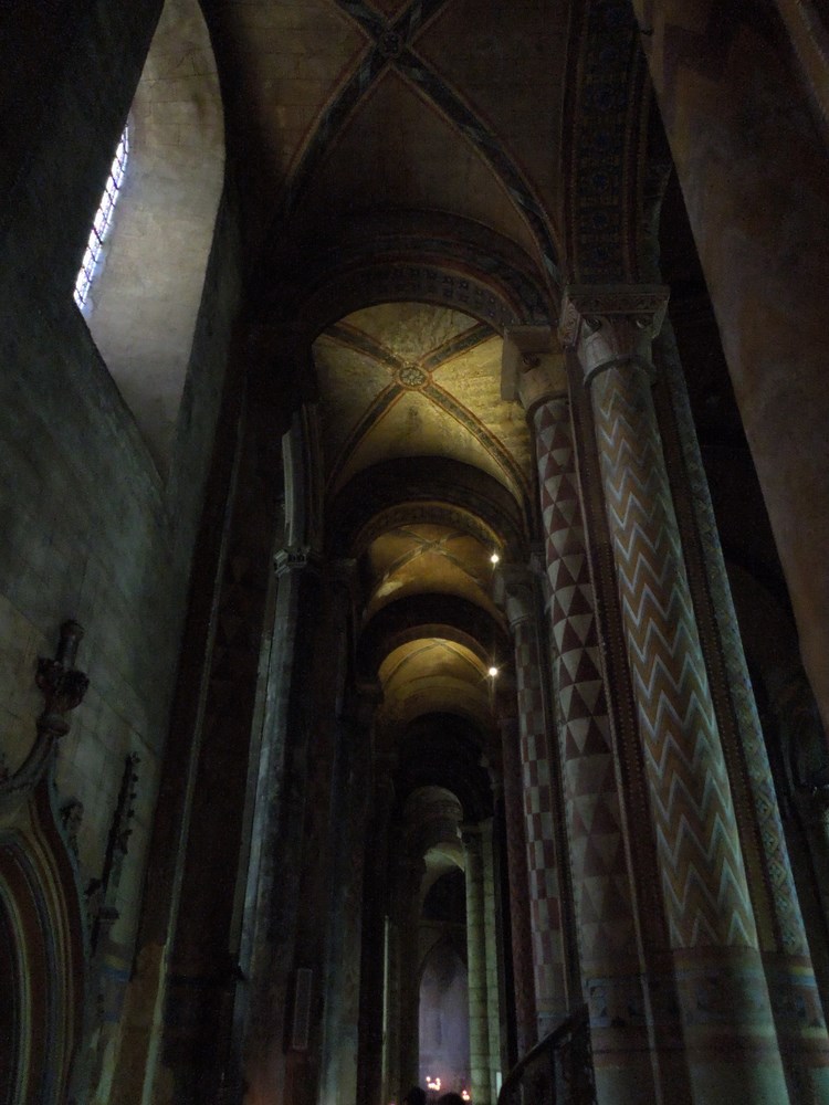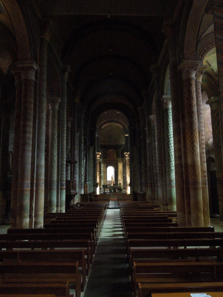 2. Seconde partie, remarquez les nombreuses colonnes peintes et dans le fond, le chœur avec la statue Notre-Dame-des-Clefs.
