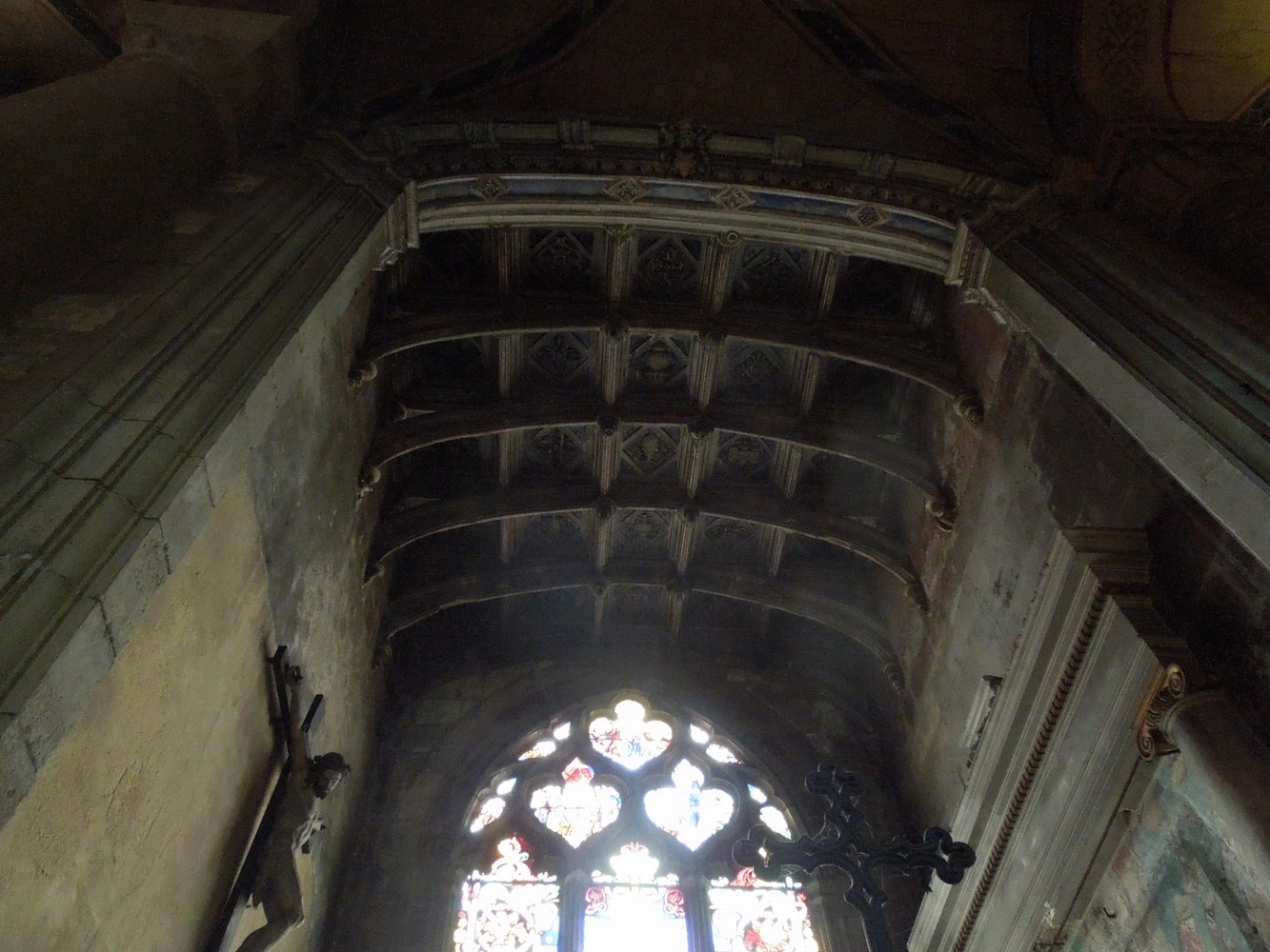 Voûte de pierre sculptée, Notre-Dame-La-Grande est l’une des premières églises voûtée de pierre, ce qui la rend résistante aux incendies. Sur le mur à gauche, un Christ en croix du XVI.