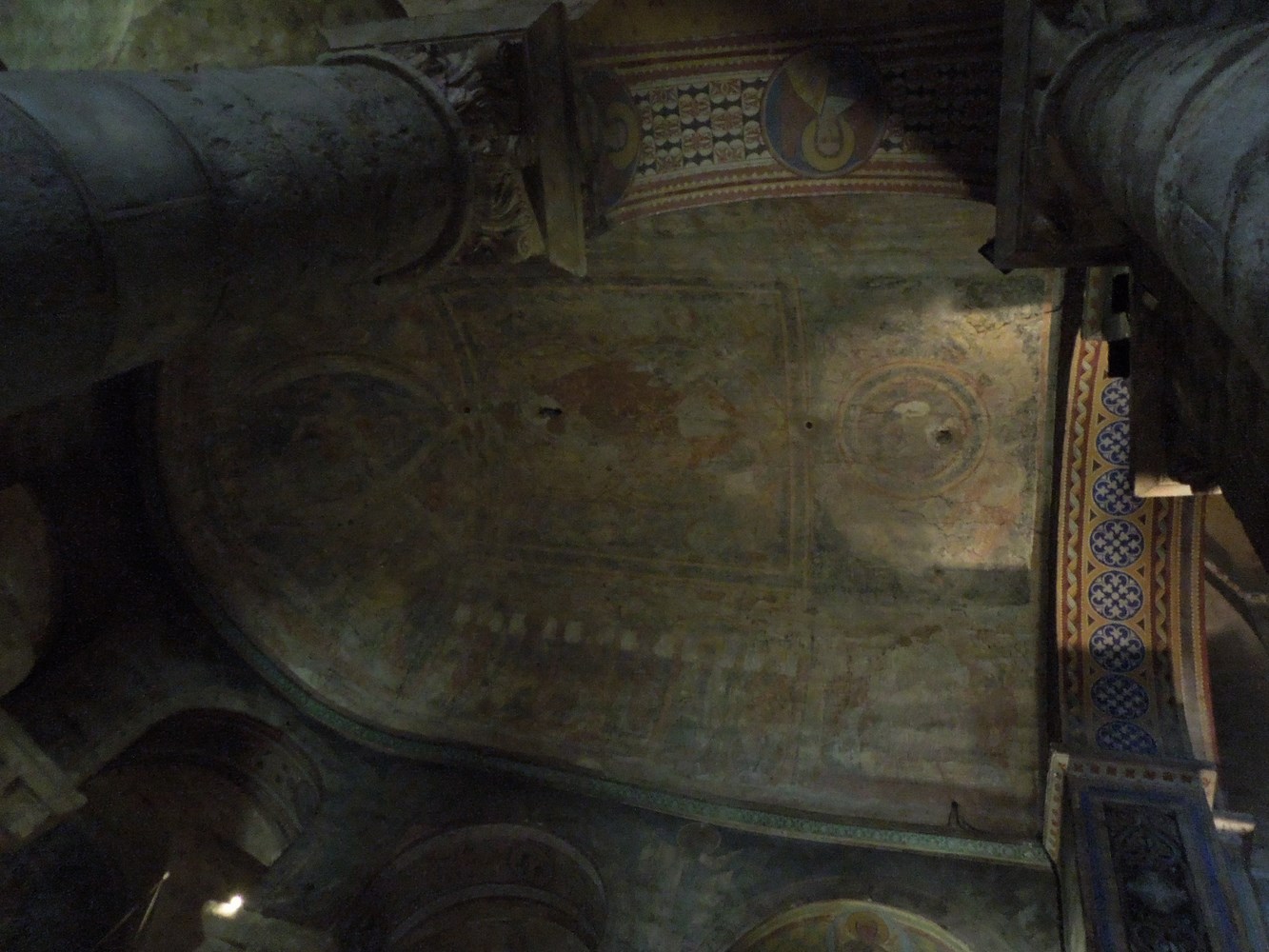 Fresque romane du XI située au dessus du chœur figurant un Christ en majesté entouré des apôtres et du tétramorphe.