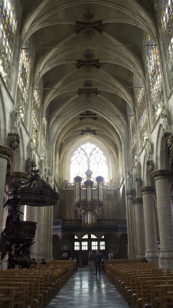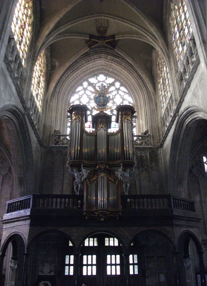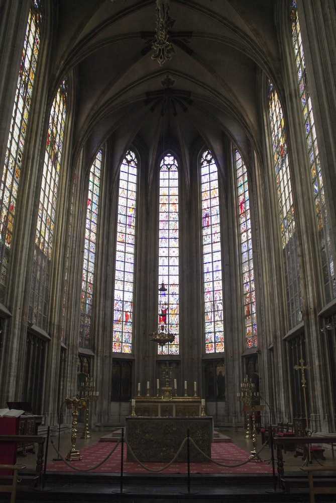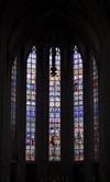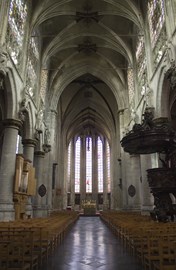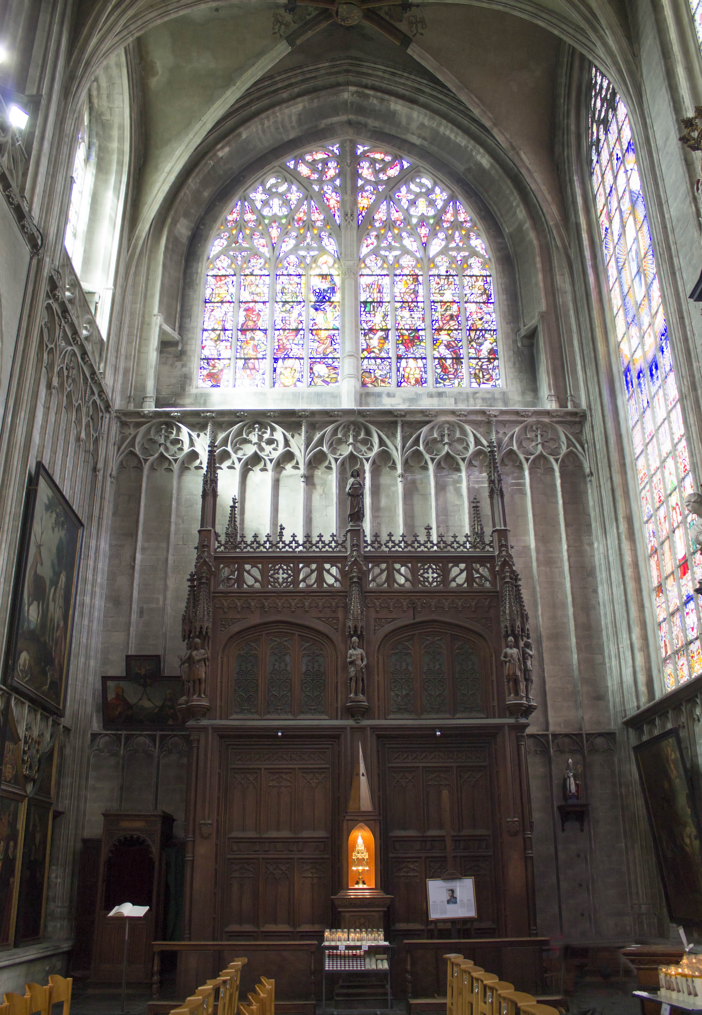 ► Particularité architecturale, le chœur est dépourvu de colonnes et de déambulatoire፧, combiné aux larges vitraux cela renforce l’aspect allongé et tirant vers le ciel de cette partie de l’édifice.