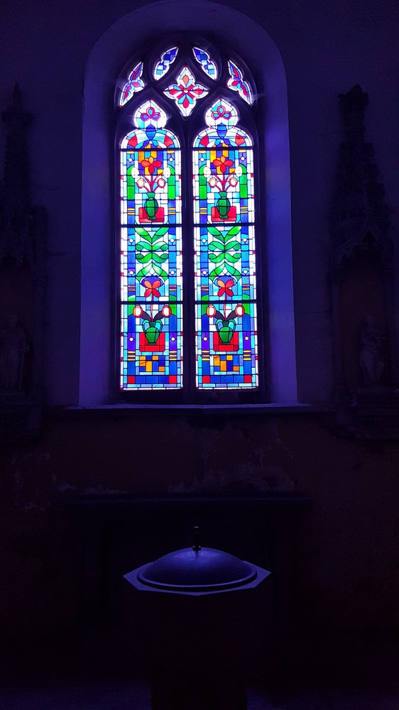 1. Chapelle à l’ambiance bleutée présentant un baptistère፧.