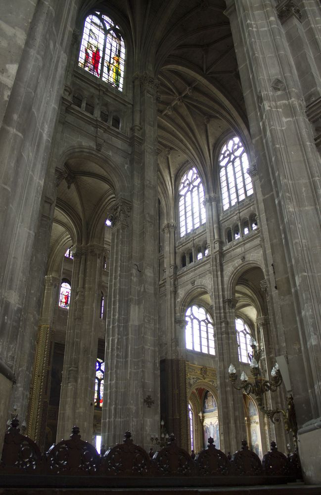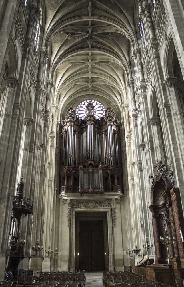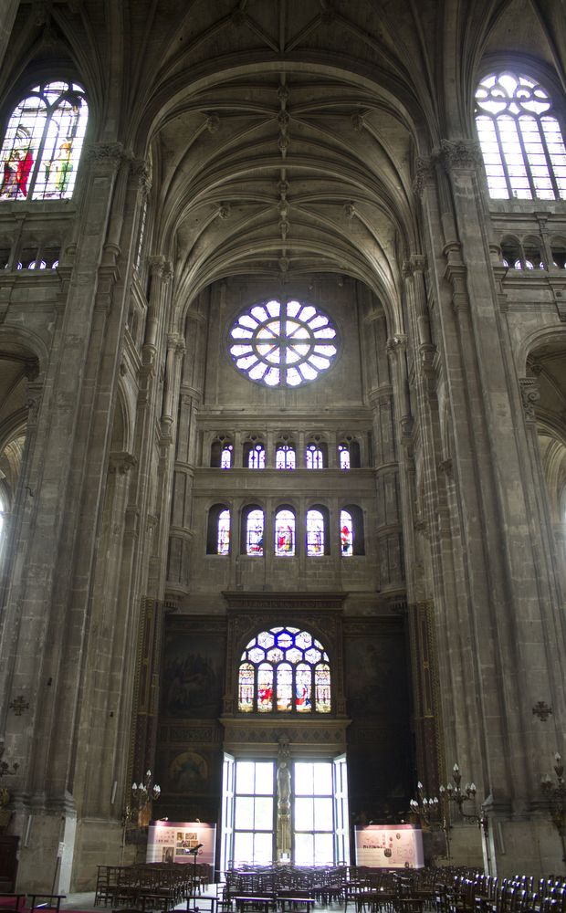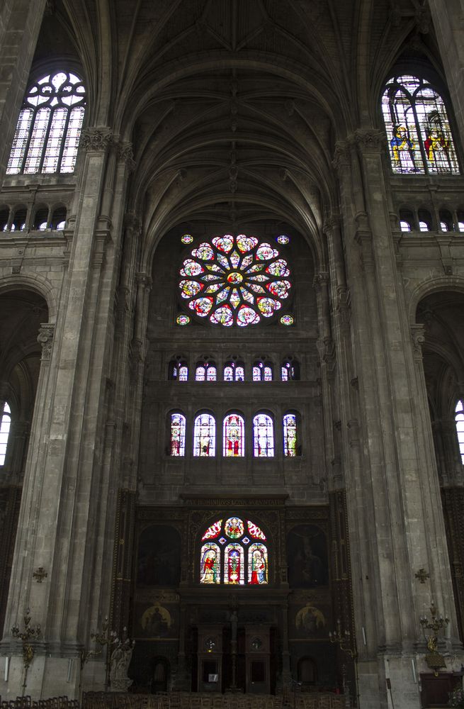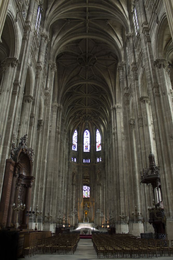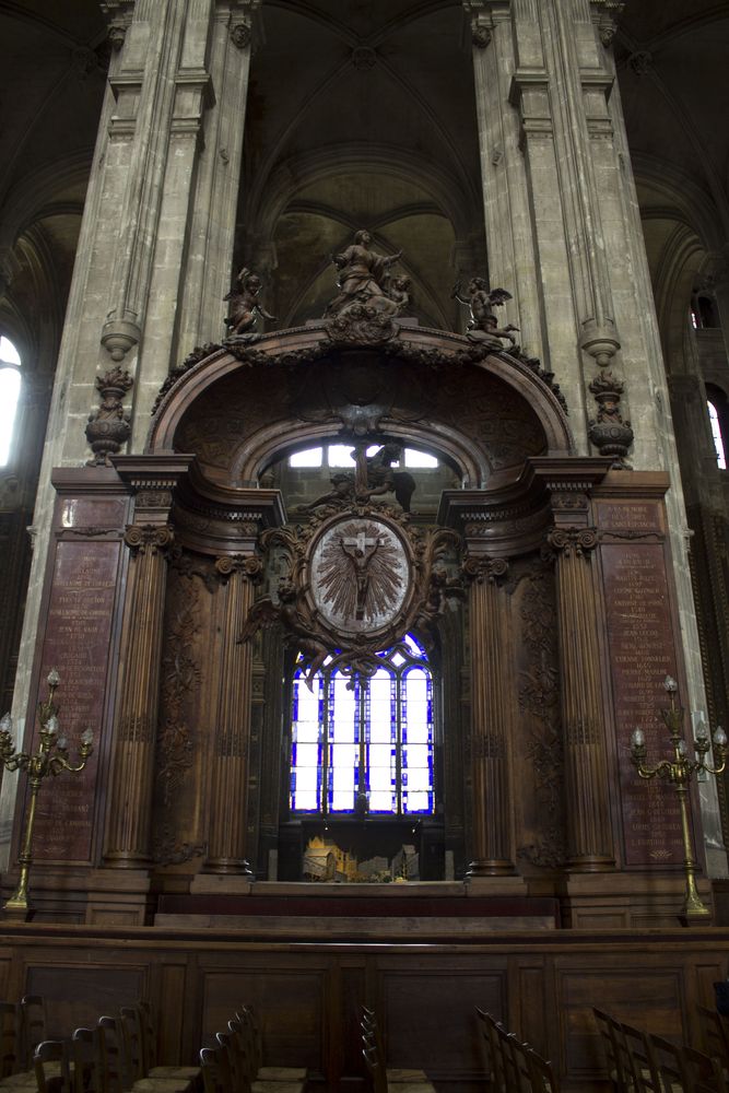 Nef depuis le portail menant au chœur avec son maître-autel. Il s’agit de la plus haute de Paris.