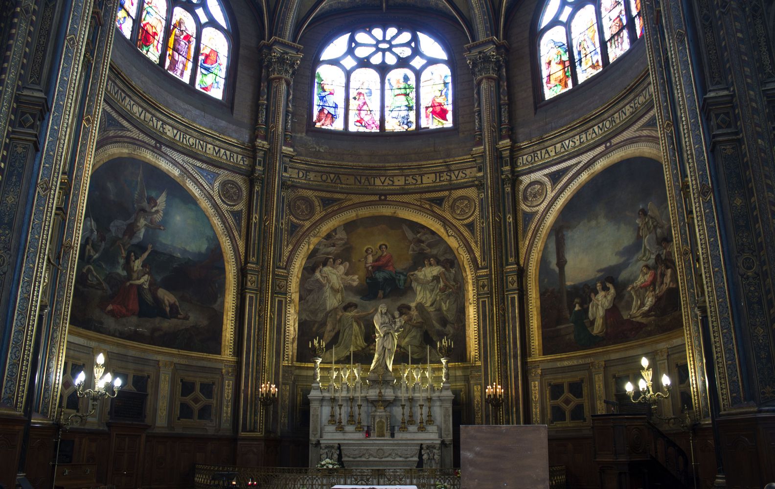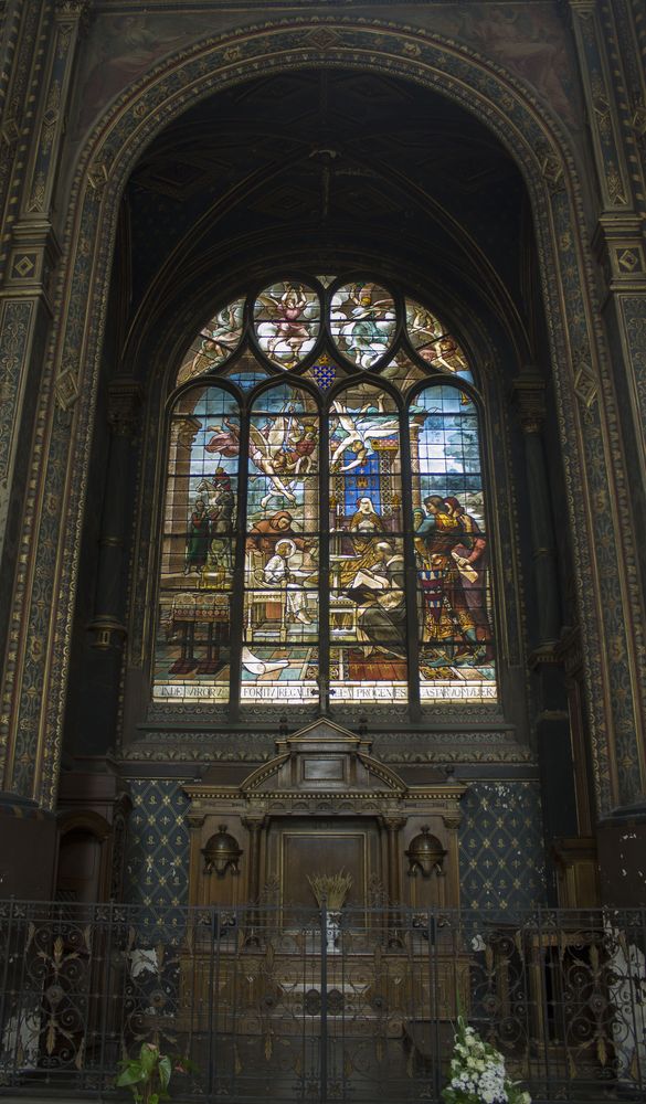 Chapelle axiale de la Vierge dont l’autel est surmonté d’une Vierge à l’Enfant de Jean-Baptiste Pigalle. Les tableaux de Thomas Couture proposent trois thématiques virginales : étoile des marins, consolatrice des affligés et adorée par les anges. Les verrières à la base du cul-de-four montrent des saints, des anges, la Vierge (centre) et David (à gauche).