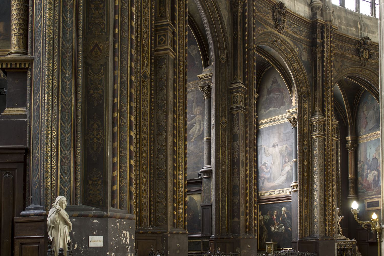 Les chapelles latérales présentent de nombreuses fresques réalisées au m.XIX par des artistes reconnus comme Félix Barrias, Alphonse Le Henaff, Jean-Louis Bezard... présenté en exemple, la Chapelle du Sacré-Cœur qui propose une fresque de Charles-Philippe Larivière.