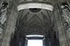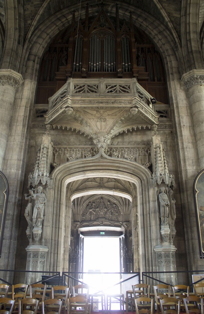 Portail occidental vu de l’intérieur surplombé par l’orgue de tribune et bardé de statues d’anges de la sm.XIX, on voit ici le tympan f.XIX de la Mission de l’Église.