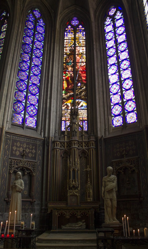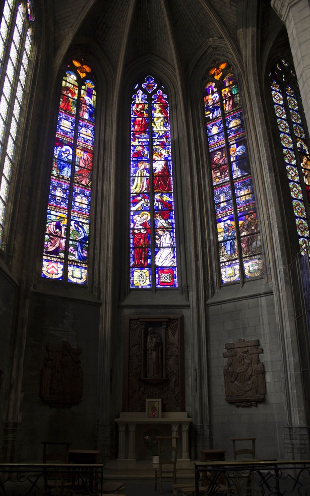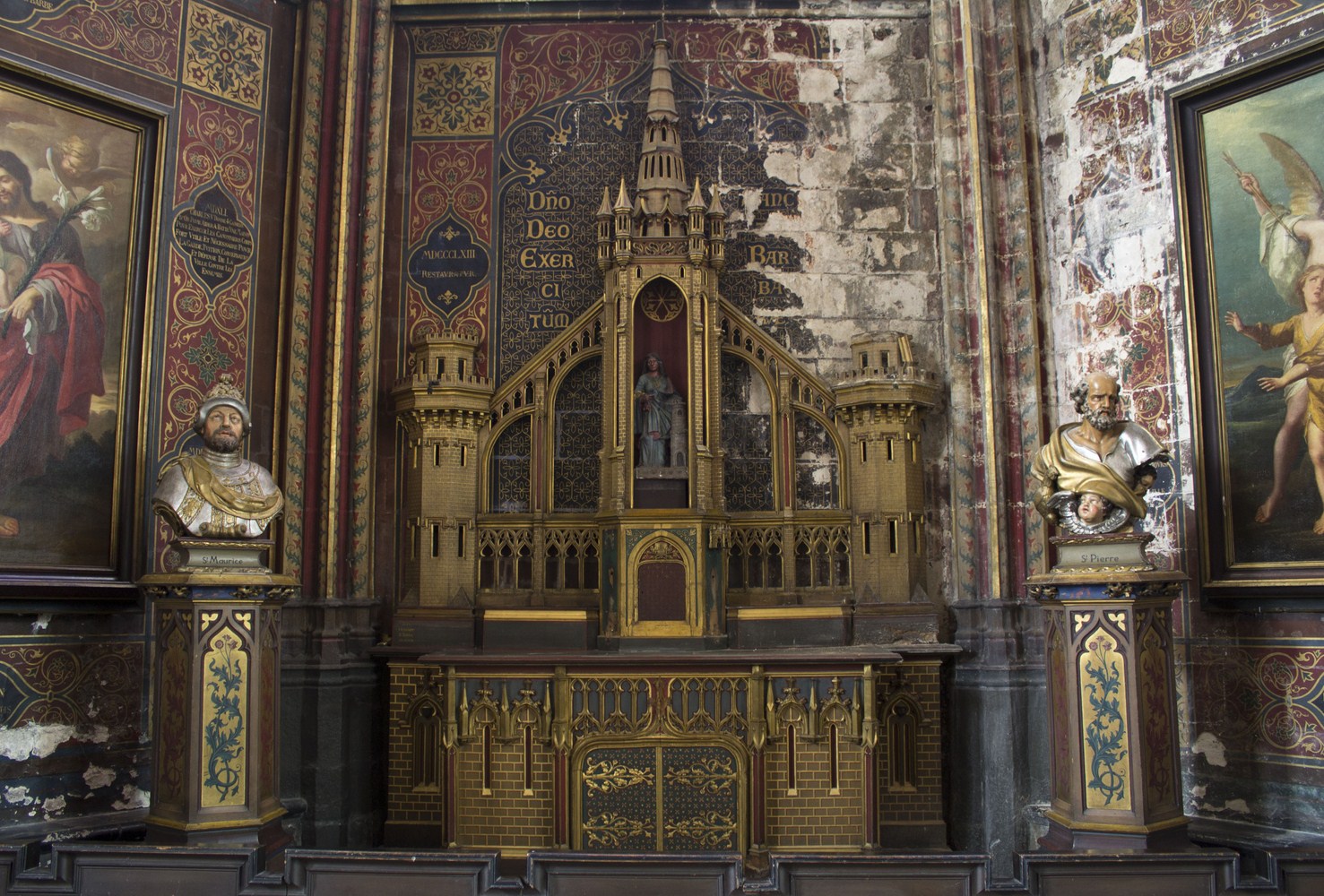 Chapelle axiale et l’Autel de sainte Barbe f.XIX. À gauche, Saint Joseph avec l’Enfant Jésus et à droite L’Ange Gardien d’Arnould de Vuez avec les bustes de st. Maurice et Pierre : les quatre sont de la f.XVII.