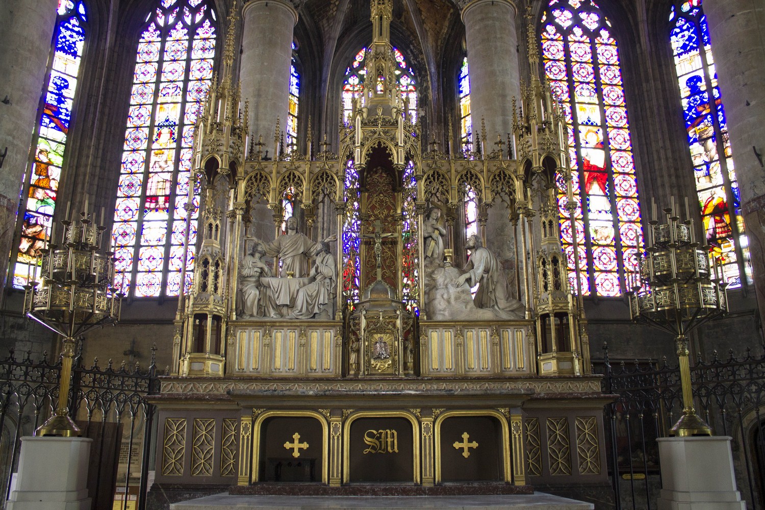 Maître-autel flamboyant de 1865 présentant deux sculptures représentant La Cène et Le Jardin des Oliviers.