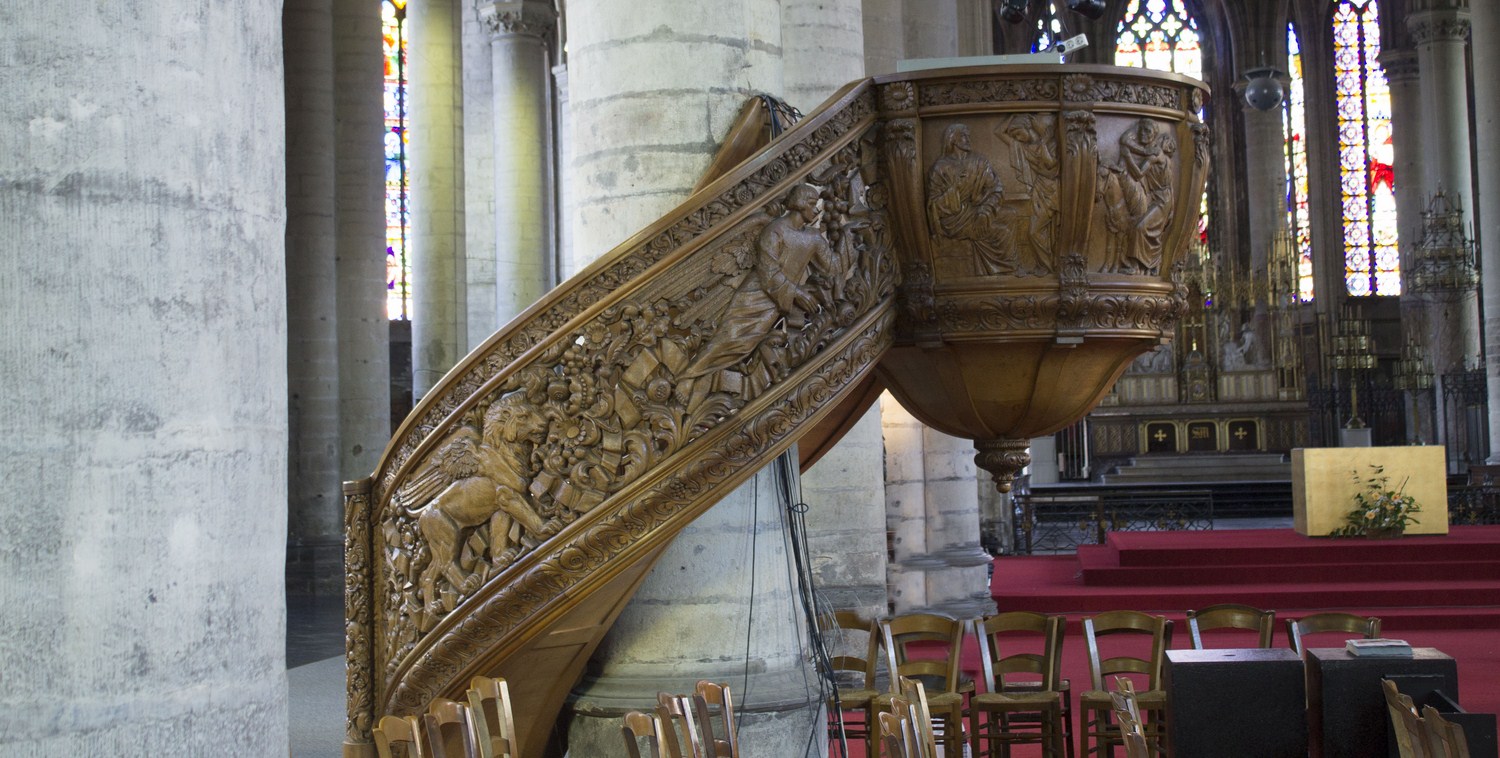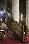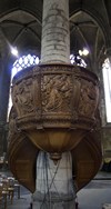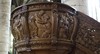Chaire à prêcher m.XX figurant le tétramorphe sur la rampe et sur les panneaux de la cuve, Jésus et la Samaritaine, le bon Samaritain, le Christ semeur, le retour du fils prodigue et la vocation de Pierre et André.