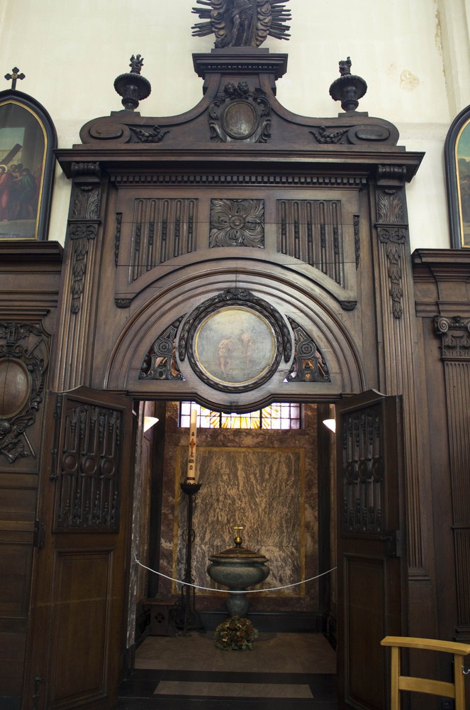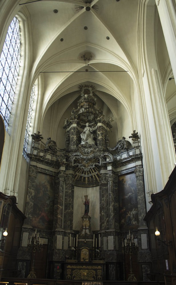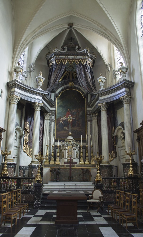 Le chœur et son maître-autel Louis XIV aux sept colonnes corinthiennes, ses reliquaires et ses stalles p.m.XVIII. Le tableau La Cananéenne de Siegen-Jacques Van Helmont est du d.XVIII.