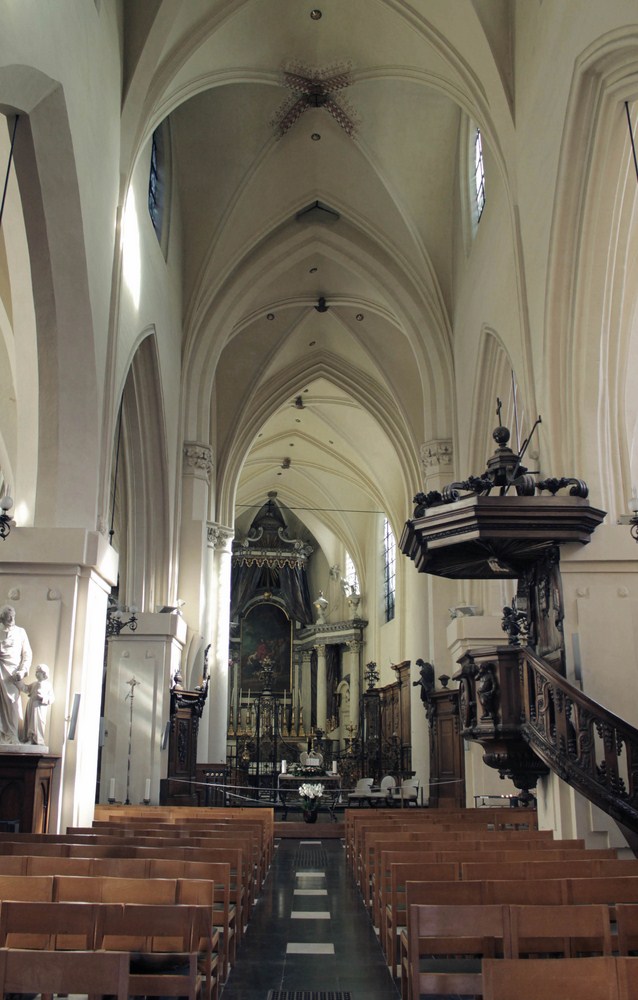 ► On note une rupture d’axe entre la nef et le chœur, cicatrice des nombreuses épreuves que l’édifice à subit mais aussi du au fait qu’on du tenir compte d’un affluent de la Senne coulant à cet endroit, le Scoenbeke. L’intérieur de l’église est peu éclairé.