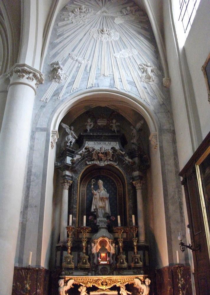 Autel de Saint-Nicolas Louis XIV de la p.m.XVIII avec une statue de 1917 et une icône russe du XI figurant le saint.