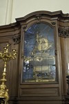 Chaire de vérité Louis XIV du XVIII représentant en médaillons sur sa cuve saint Nicolas avec les trois enfants et l’œil de Dieu.