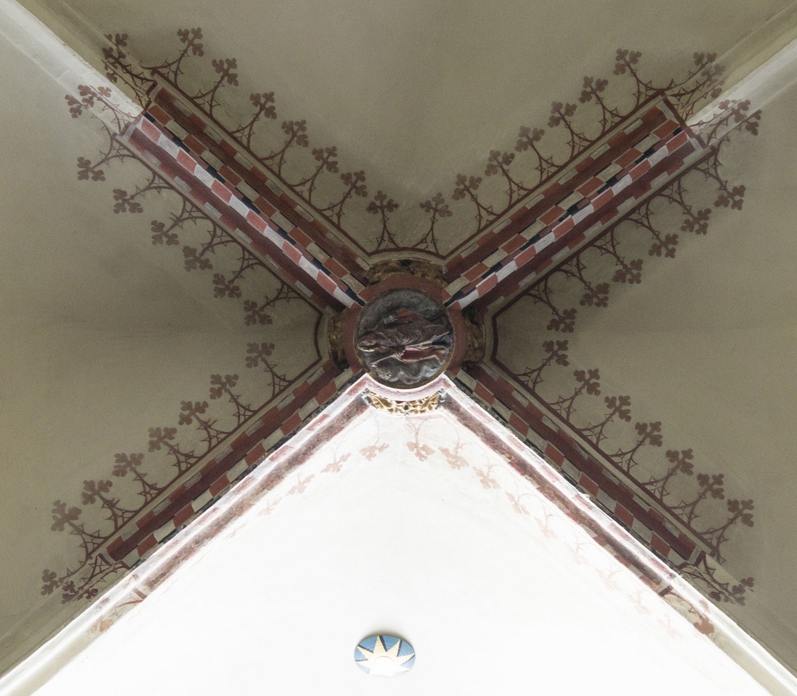 Différentes clefs de voûtes de l’église représentant pour les plus travaillés, la Vierge, saint Jacques le Majeur, le Couronnement de la Vierge ou saint Pierre.