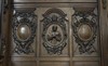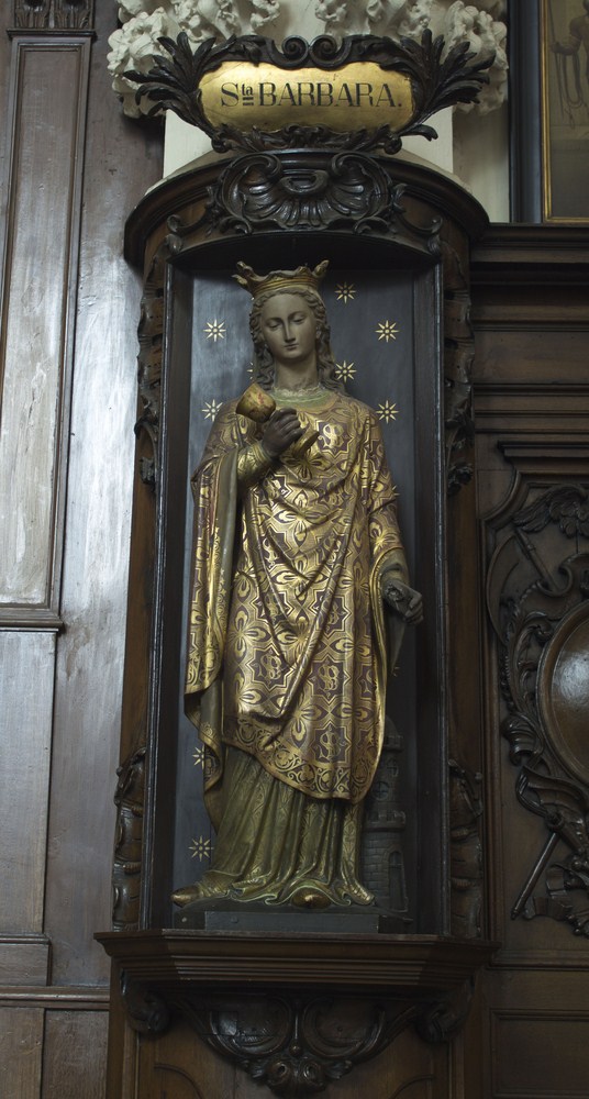 Statue de sainte Barbe patronne des métiers liés au feu, à sa droite, des boiseries composées de trois médaillons.