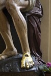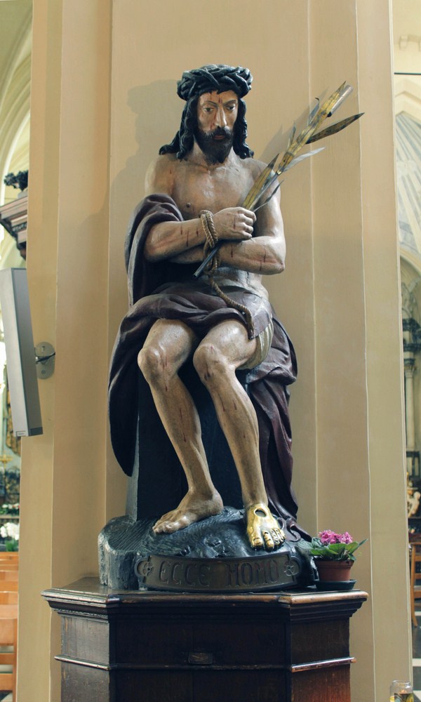 ◆ Traditionnellement, le pèlerin en visite touche le pied d’or du Christ à l’entrée de l’édifice 🗎⮵. Il réitérera ce geste sur le bras du gisant du Christ qu’il trouvera sous les arcades de la Maison de l’étoile situé sur la Grand-Place.