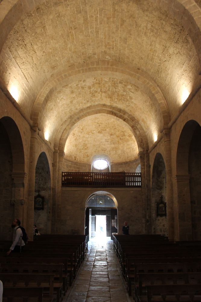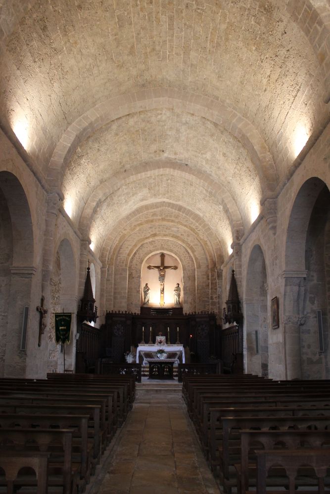 Nef du portail au chœur menant au maître-autel. On peut voir la voûte en berceau supportée par des arcs doubleaux légèrement brisés.