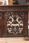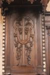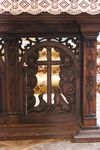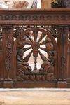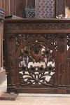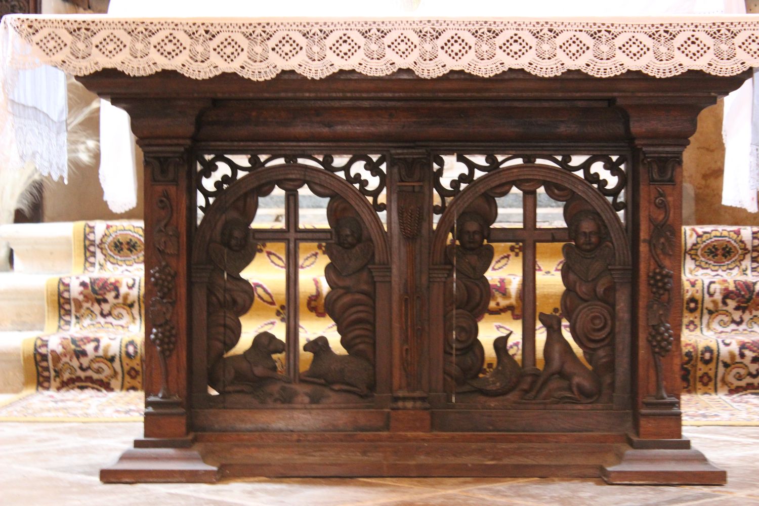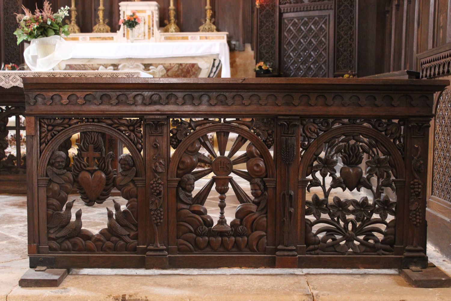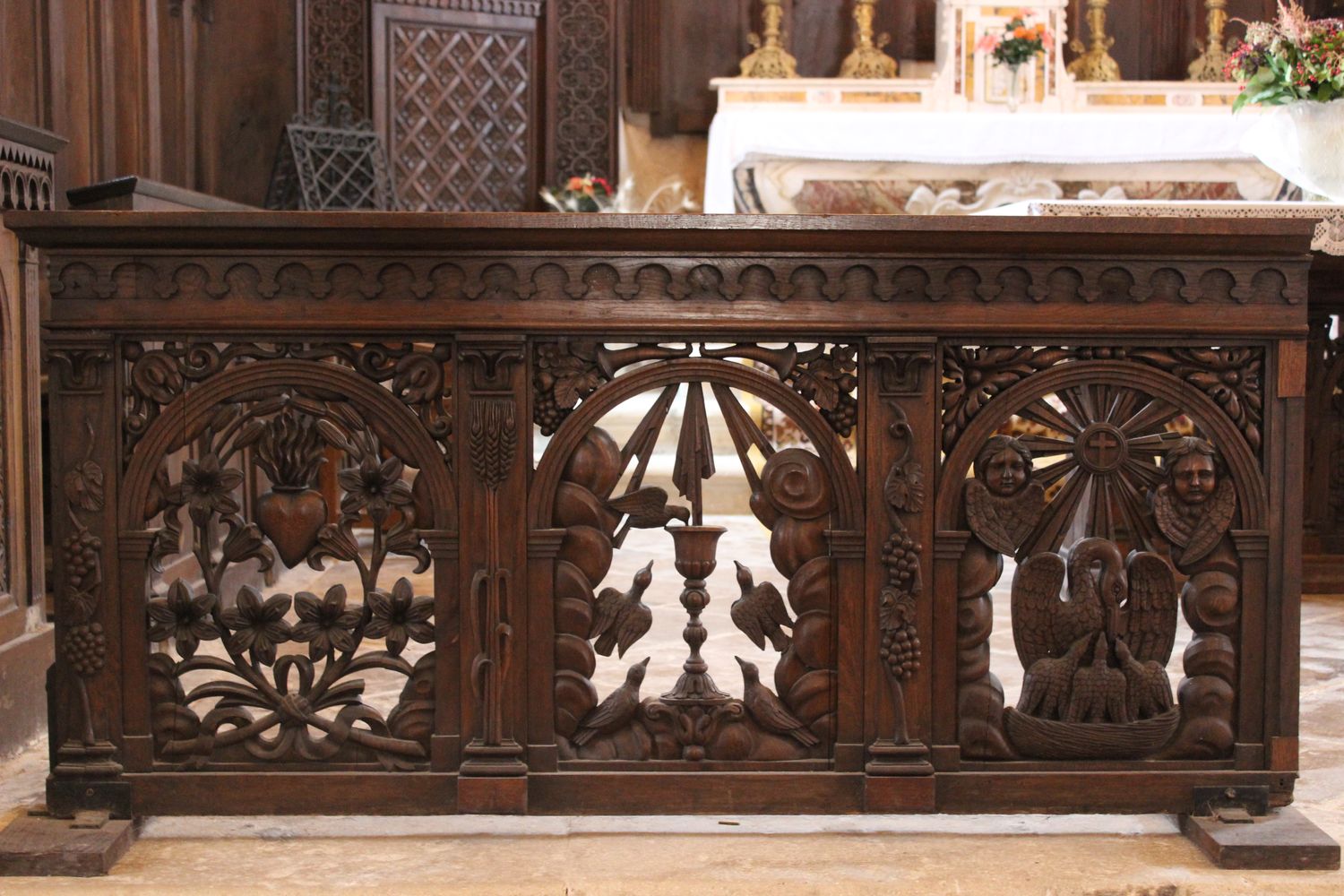 Partie gauche de la clôture du chœur : sacré-cœur aux lys, oiseaux au calice et pélican sacrificiel.
