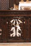 Partie droite de la clôture du chœur : sacré-cœur glorieux, calice triomphant et sacré-cœur aux lys.