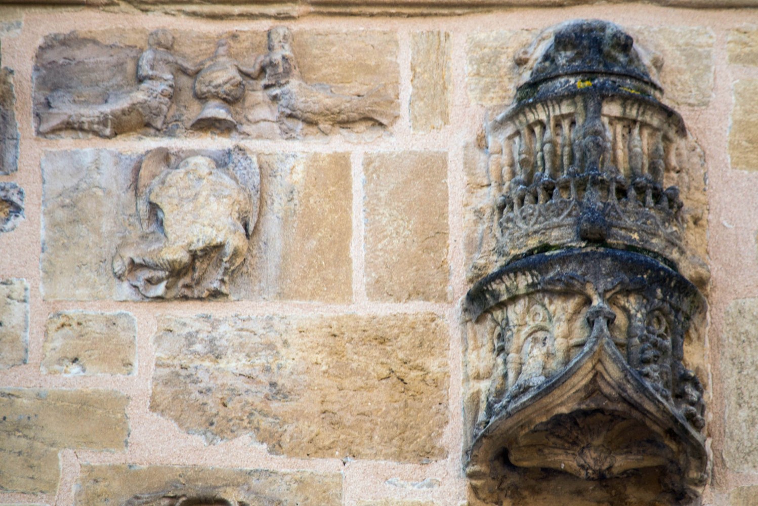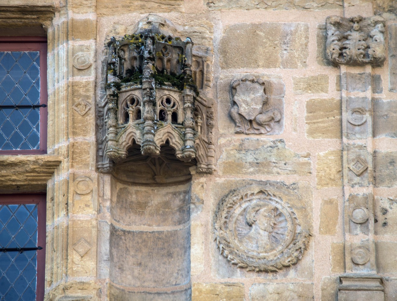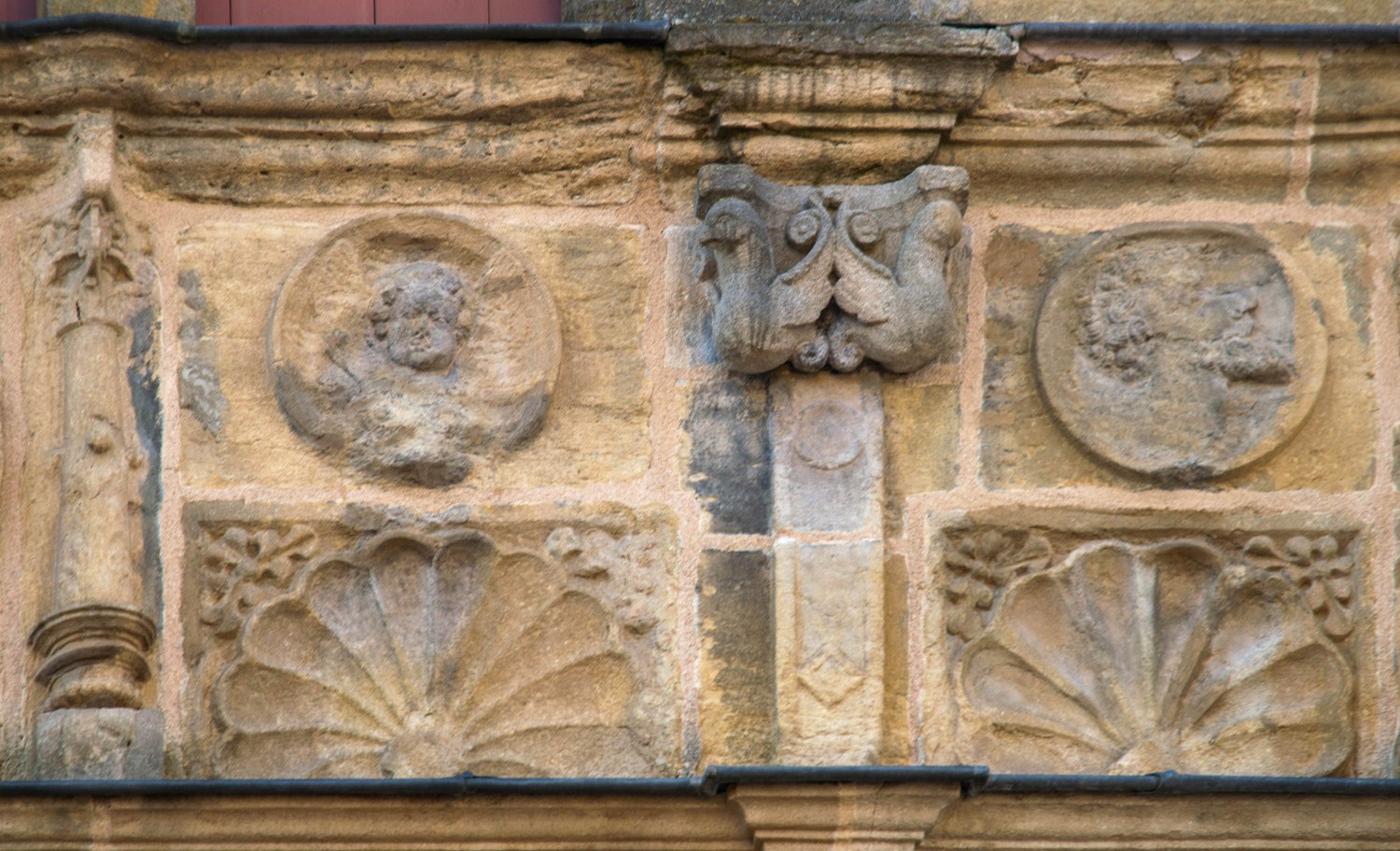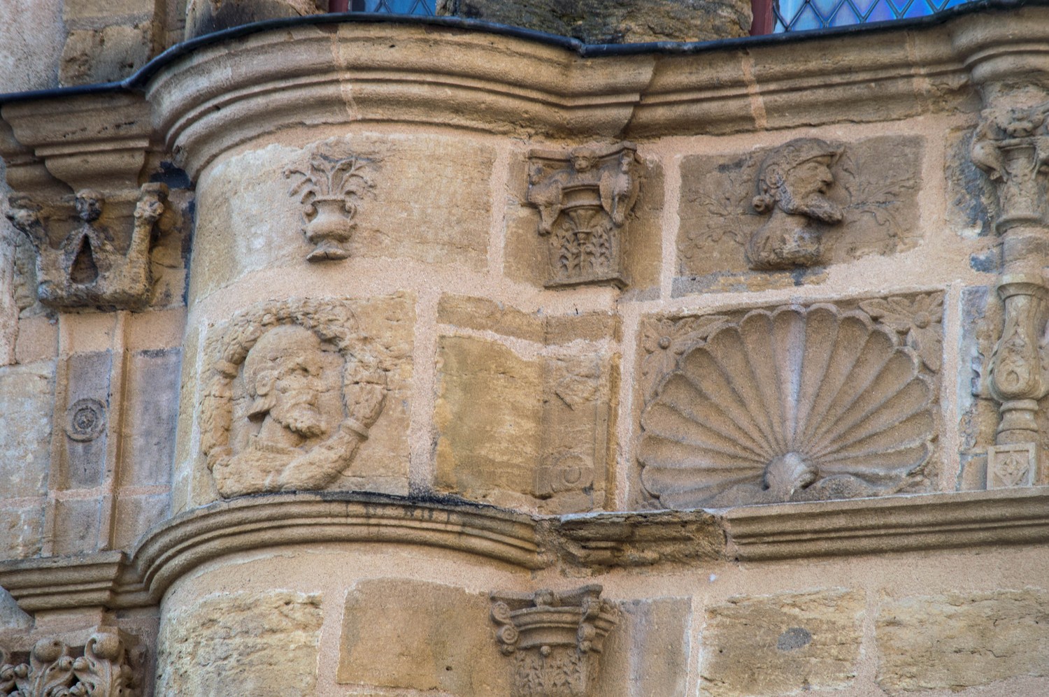 ► Très riche et bien conservée, la façade est composée de trente huit visages : vingt-six médaillons(2), deux visages encadrés et dix visages. Ensuite, au moins quinze statuettes de poupons(3), leur présence expliquant l’un des noms que l’on donne à l’édifice. On y voit aussi quinze coquilles Saint-jacques soulignant au moins l’idée du pèlerinage et enfin de nombreux ornements animaux et floraux dans des attitudes révélatrices. On a cru identifier les personnages dans les médaillons comme étant des notables locaux ou des rois de France. Avec plus de certitude, on identifie les deux représentations de l’homme et de la femme se tenant en trois quart, comme au bord de fenêtres de l’édifice, qui seraient probablement Jayet et sa femme.