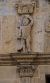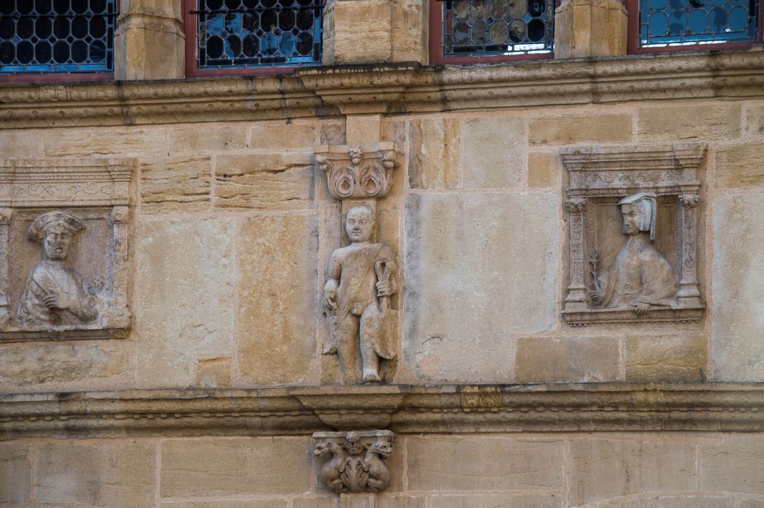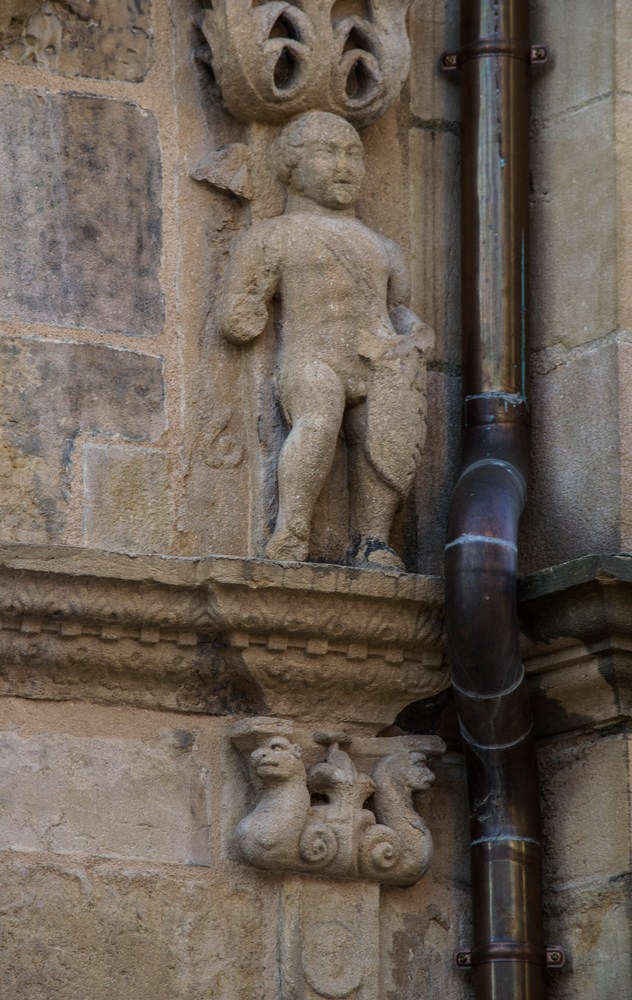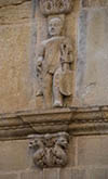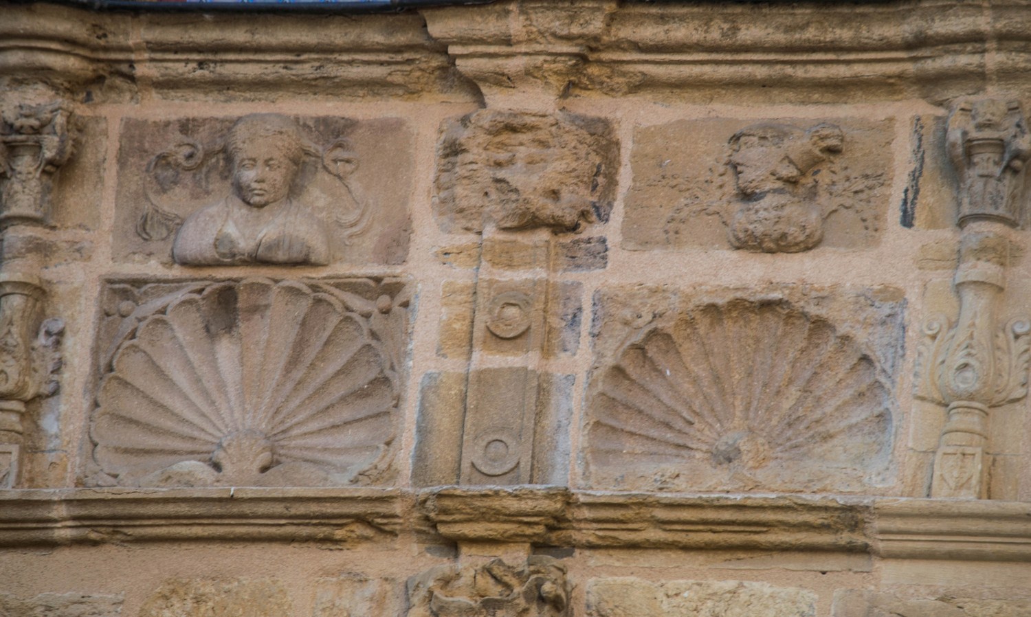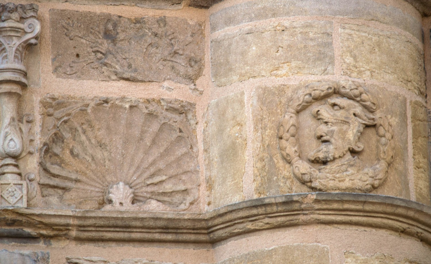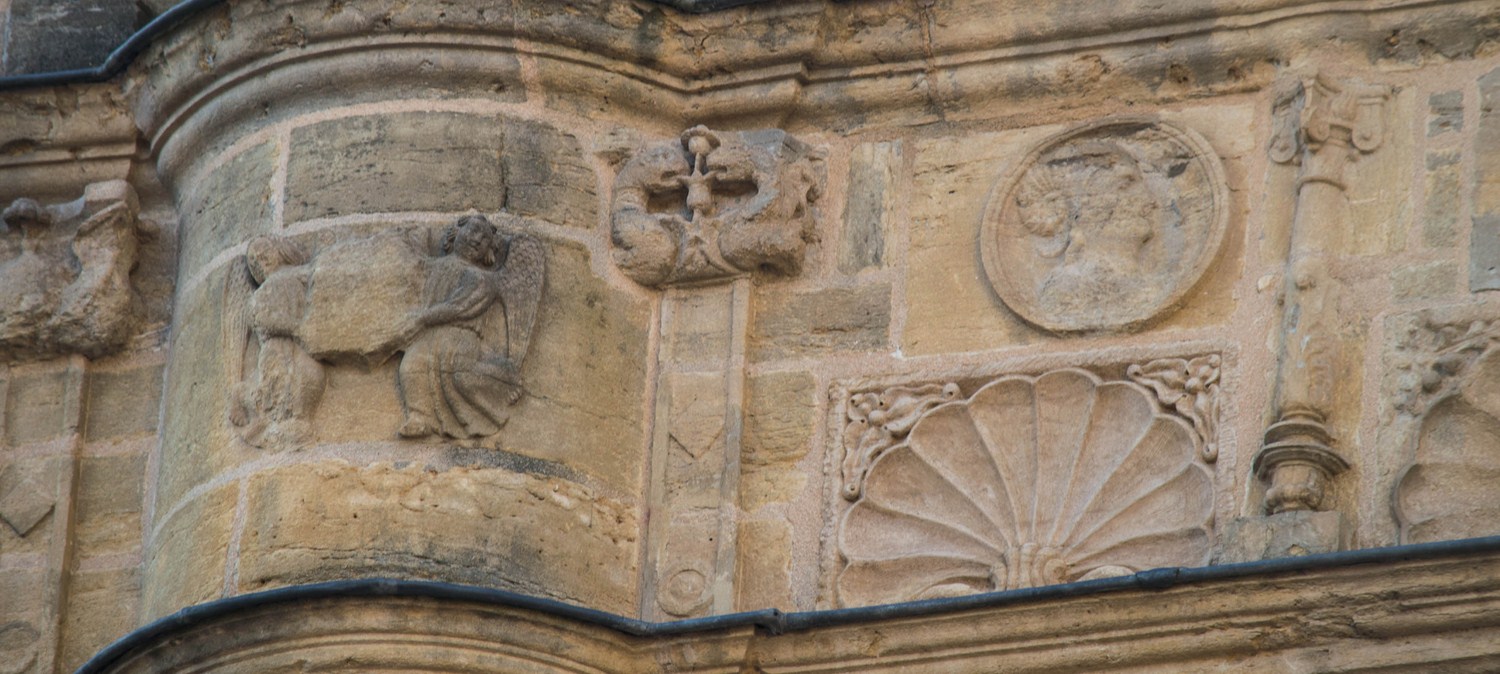 ► Très riche et bien conservée, la façade est composée de trente huit visages : vingt-six médaillons(2), deux visages encadrés et dix visages. Ensuite, au moins quinze statuettes de poupons(3), leur présence expliquant l’un des noms que l’on donne à l’édifice. On y voit aussi quinze coquilles Saint-jacques soulignant au moins l’idée du pèlerinage et enfin de nombreux ornements animaux et floraux dans des attitudes révélatrices. On a cru identifier les personnages dans les médaillons comme étant des notables locaux ou des rois de France. Avec plus de certitude, on identifie les deux représentations de l’homme et de la femme se tenant en trois quart, comme au bord de fenêtres de l’édifice, qui seraient probablement Jayet et sa femme.