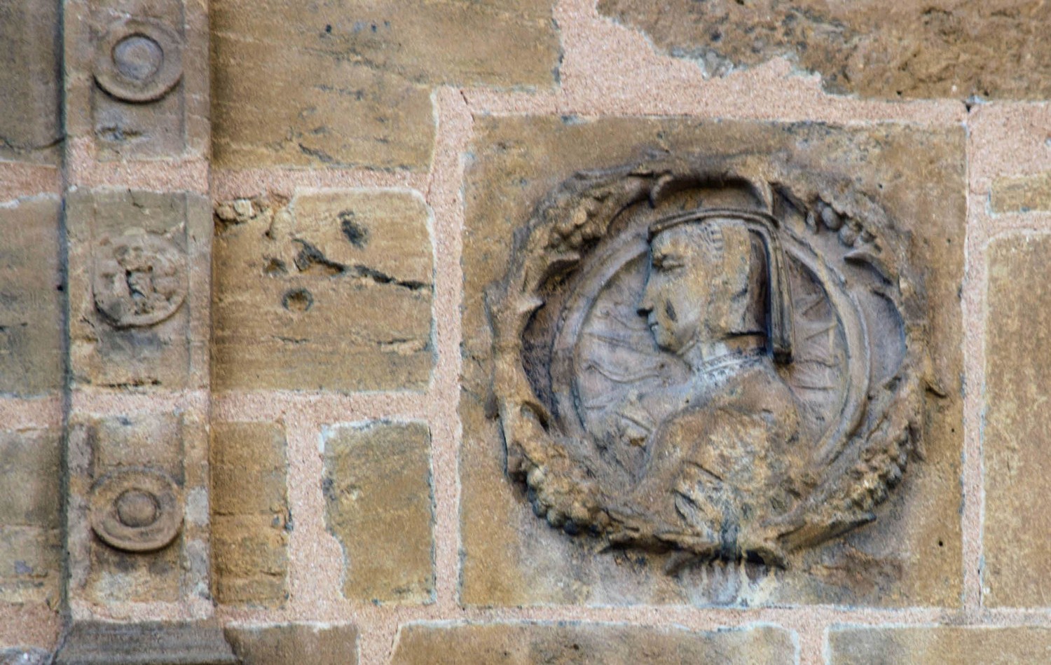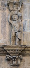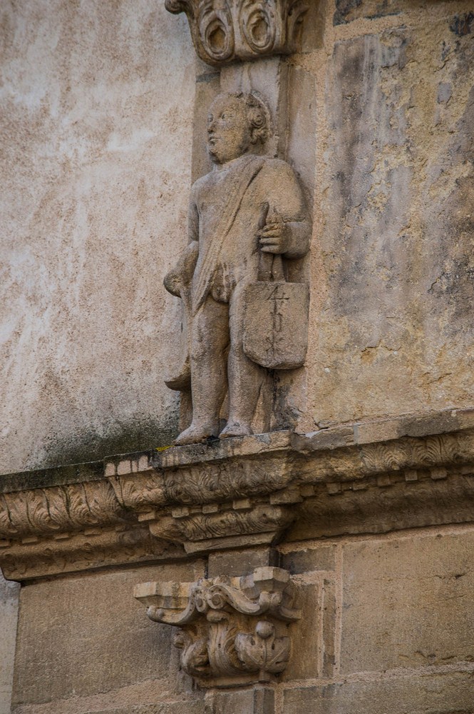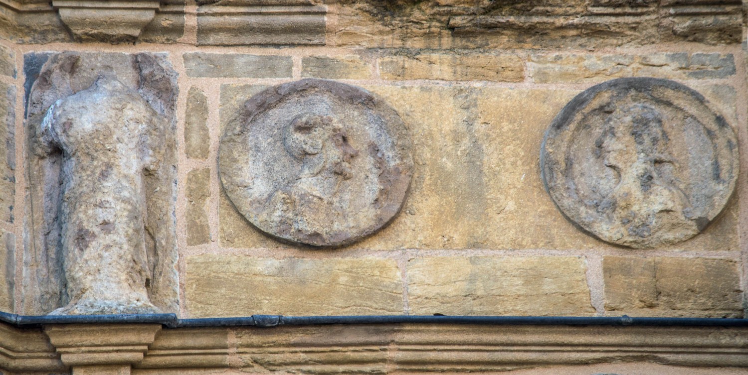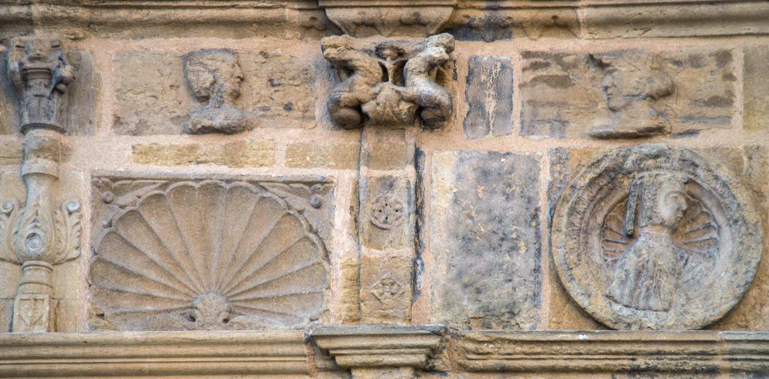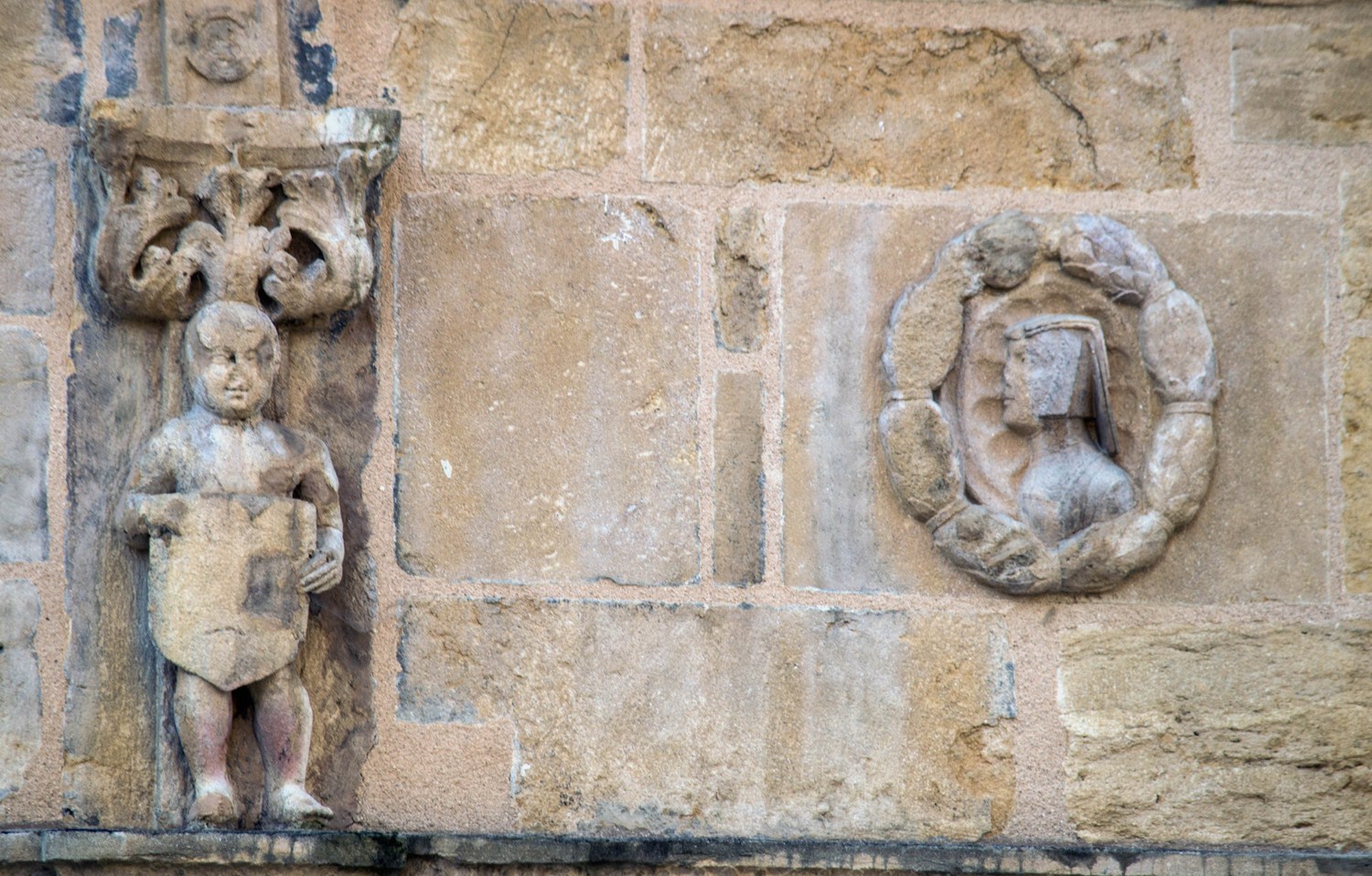 ► Très riche et bien conservée, la façade est composée de trente huit visages : vingt-six médaillons(2), deux visages encadrés et dix visages. Ensuite, au moins quinze statuettes de poupons(3), leur présence expliquant l’un des noms que l’on donne à l’édifice. On y voit aussi quinze coquilles Saint-jacques soulignant au moins l’idée du pèlerinage et enfin de nombreux ornements animaux et floraux dans des attitudes révélatrices. On a cru identifier les personnages dans les médaillons comme étant des notables locaux ou des rois de France. Avec plus de certitude, on identifie les deux représentations de l’homme et de la femme se tenant en trois quart, comme au bord de fenêtres de l’édifice, qui seraient probablement Jayet et sa femme.