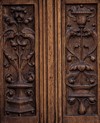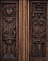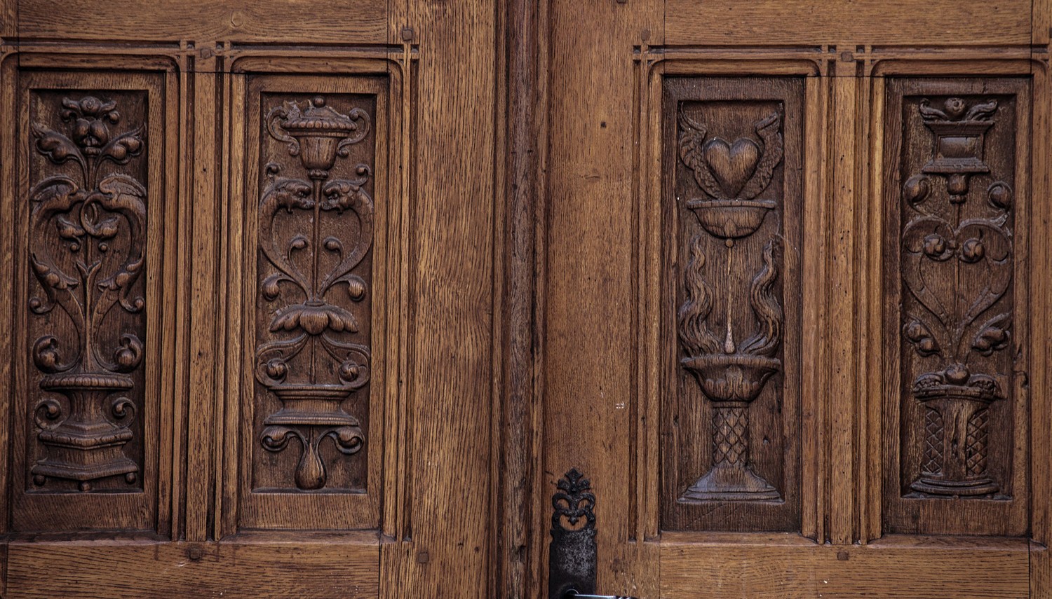 ◆ La porte n’est pas en reste et on peut y apercevoir un calice dont l’iconographie évoque le Graal, l’Arche d’alliance ou encore le Sacré-Cœur, dévotion chère à la ville depuis les visions de Marguerite-Marie Alacoque et l’organisation de pèlerinages à la Basilique de Paray-le-Monial.