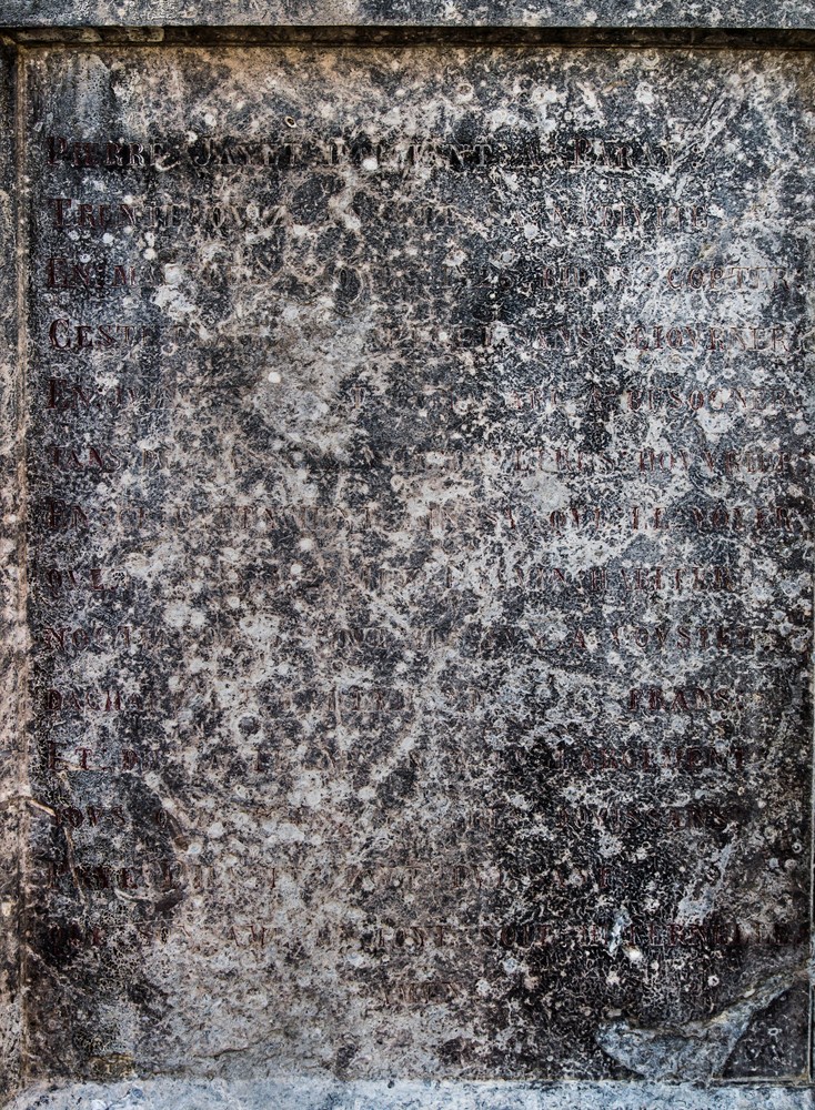 ⟴◆ La plaque commémorative écrite en lettres gothiques du XVI est peu lisible. L’inscription indique : Pierre Jayet habitant à Paray, Trente-huit ans de sa nativité ; ceste place a chepta et sans séjourner, En juing suivant comasare à besogner, Tans de massons avec d’autres houvriers, En ce battyment… francs. Et de la peyne en a eu largement. Vous qui après ey seres iouissant, Prye Dieu le Tout Puissance, Que son âme en ioye soit éternelle. Amen. Audaces fortuna juvat.
