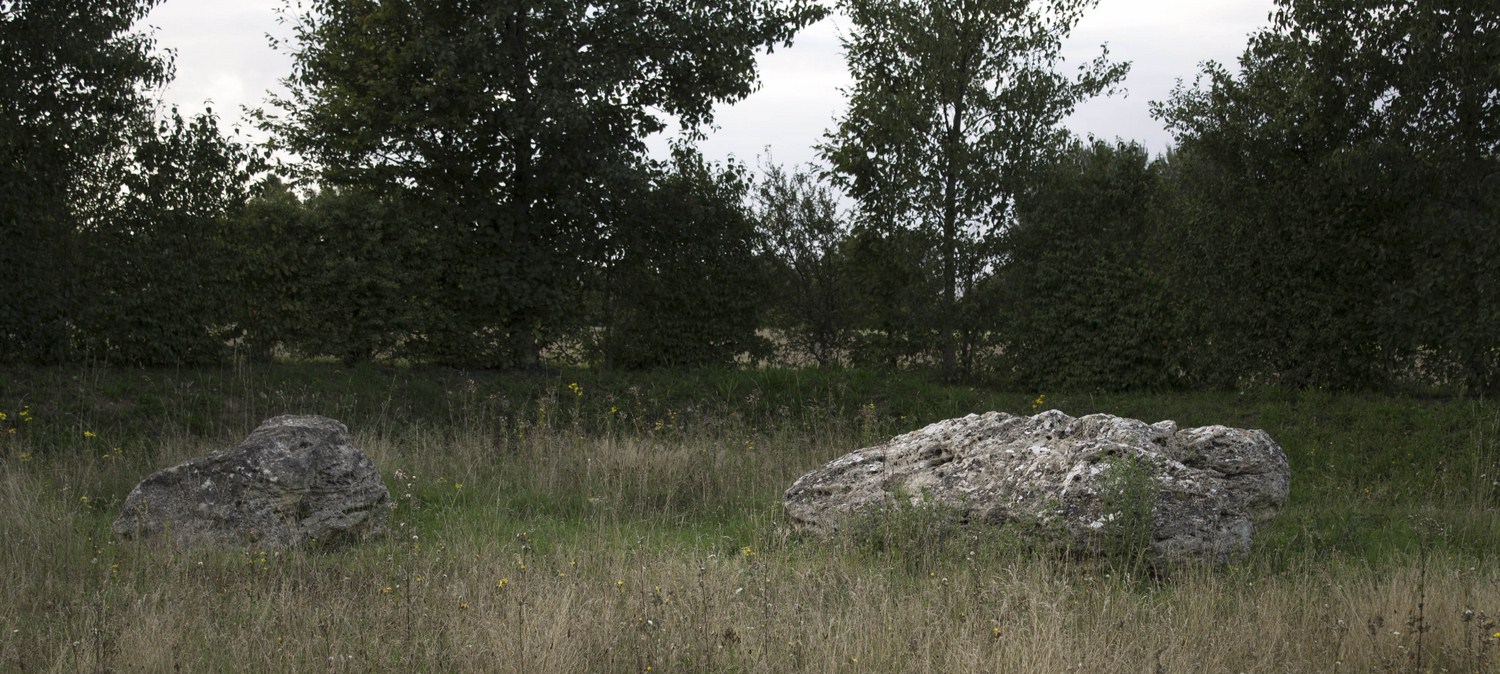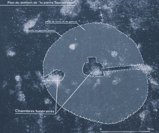 ► Dolmen à couloir compris dans un cairn circulaire de 25 mètres de diamètre qui est l’un des plus grand de Normandie, il est mentionné pour la première fois en 1869 dans les Mémoires de la Société des antiquaires de Normandie. Le site à l’instar de très grand nombre de mégalithes tire son nom d’une légende locale qui affirme que la pierre était capable de tourner sur elle-même. Il ressemblait à une simple bute d’où dépassait une grande dalle de calcaire jusqu’à ce que des sondages mandatées par le gouvernement en 1992 invitent la commune voisine de Cairon à en faire l’acquisition et à organiser des fouilles de 1996 à 1999. Le dolmen restitué, le site est désormais mis en valeur et entretenu par ses propriétaires à des fins pédagogiques.