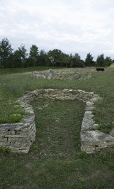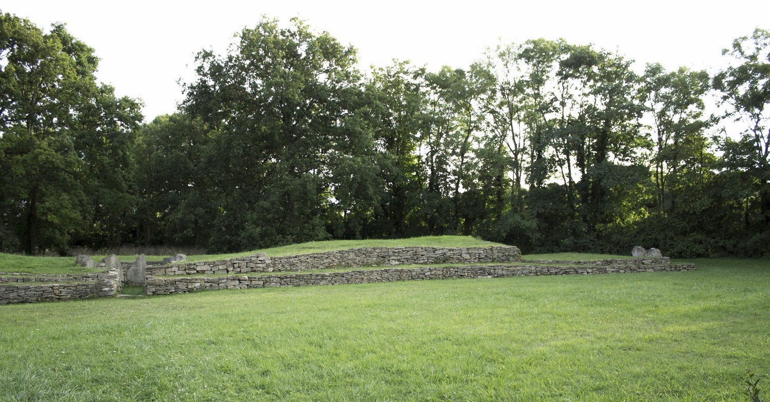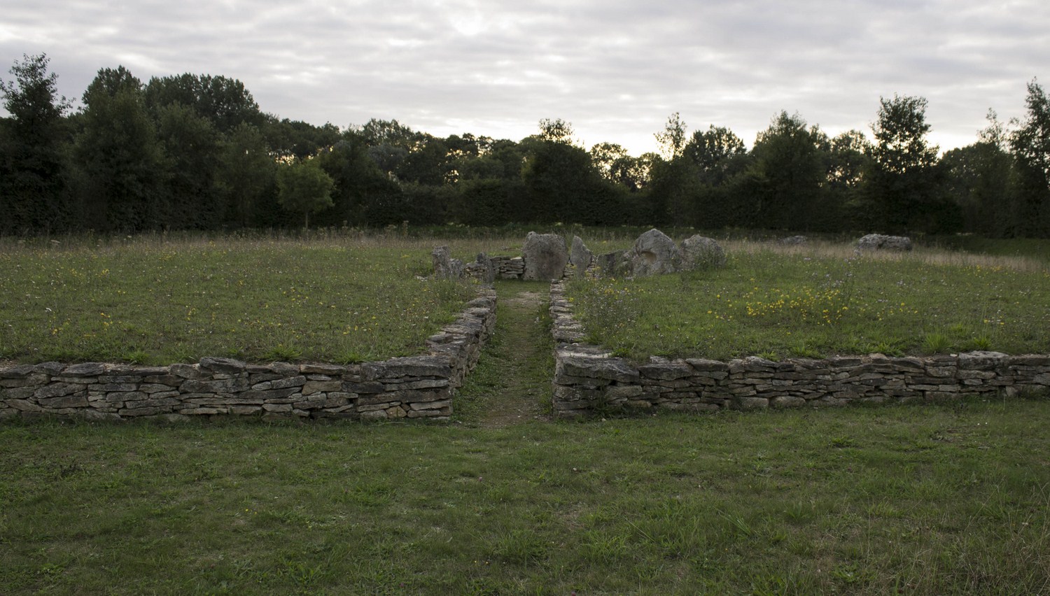 ► Le site était vraisemblablement pourvu de palissades légères et est orienté est-ouest. Il se compose d’un couloir de 10m. de long puis de deux chambres funéraires, l’une étant l’aboutissement du couloir et l’autre disposant de sa propre entrée à l’opposée du cairn. On a mis à jour un mobilier essentiellement composé d’une centaine de poteries céramiques et d’un peu plus de cinq cent outils lithiques ainsi que de les restes d’une dizaine d’individus dans la première chambre. Dans la seconde, fait rare, les restes d’une seule personne, un enfant, paré d’un collier orné d’une dent de chien percée.