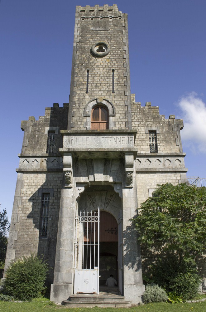 ► Auguste Letenneur, le commanditaire de l’édifice, est un marchand Roncyais né le 27 Septembre 1832 d’une famille paysanne. D’abord ambulant, il investit ensuite dans différents magasins dont le plus important se trouve à Saint-Lô, l’expansion du chemin de fer se révèle favorable à son activité et le rend riche. Comme en témoigne sa bibliothèque, il est intéressé par les questions d’ordre spirituelles et il lance la construction du mausolée sur sa propriété de la Rousserie en 1900, la mairie ayant rejeté son projet de fixer la bâtisse dans le cimetière communal. Il le destinait à être la dernière demeure de son épouse et lui-même ainsi que celle de tout ses descendants qui en exprimeraient le souhait, hormis ceux de mauvaises mœurs. Il meurt d’un accident agricole le 28 Novembre 1916 et y sera inhumé jusqu’en 1972 où on le déplace au cimetière communal. Faute d’entretien le mausolée sera vendu en 1993 par les descendants d’Auguste à la commune de Roncey qui l’a depuis ouvert au public.