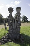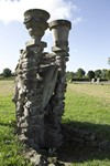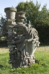 ◆ Cette construction en granit, à cheval entre un château et le tombeau se veut le symbole de l’élévation spirituelle. On trouve encore non loin, la fontaine en béton dite Le Pucelage dédiée à Vénus, qui est construite entre 1885 et 1887 sur une source naturelle et des mains d’Auguste. Elle est quant à elle, sous la forme d’un coquillage évoquant le sexe féminin, le symbole de la femme en tant que source de vie, symbole de vie qui est renforcé par l’arrière de la sculpture représentant un saule pleureur et dont la forme évoque les artères d’un cœur. La sculpture est enfin surmontée de deux vases tenus par deux bébés folâtres, l’un ouvragé et antique et l’autre moderne et en terre, afin de signifier l’inégalité des hommes à la naissance. Letenneur ajoute qu’ils semblent dire : Aux braves gens vertueux, ah immuable amour / La vie jeune et vieux, c’est l’image d’un jour ; / Profitez de l’Hymen, mais craignez jusqu’au soir / de mettre à néant votre nom, votre gloire.