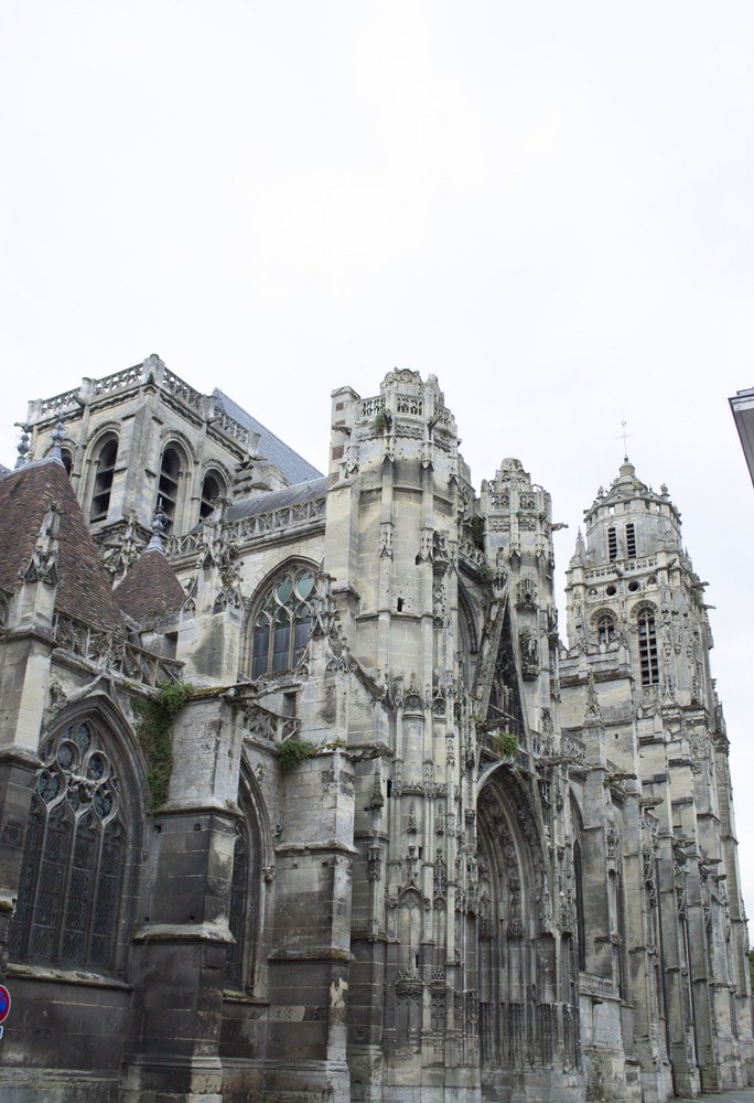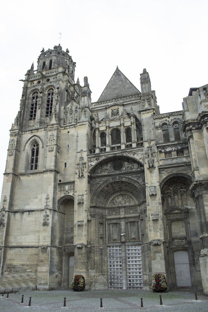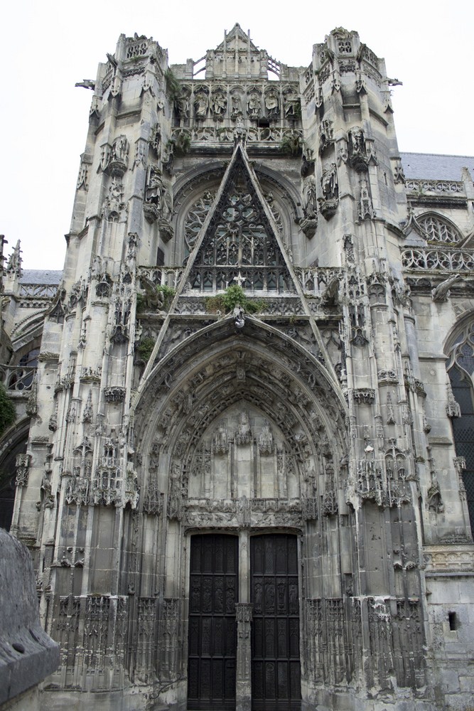 ► Au m.XV l’édifice est délabré faute d’entretien et on décide de le rénover. On remanie d’abord le chœur : on y ajoute un déambulatoire፧ et des chapelles rayonnantes entre 1497 – 1510. En 1490 – 1547 on refait le transept qu’on finit en 1515 et on reconstruit la nef avec une élévation sans discontinuité et sans chapiteaux comme on en a l’habitude dans le gothique normand. On y ajoute sur ses collatéraux des chapelles flamboyantes financées par des confréries et des corporations. En 1516 – 1580 enfin, on refait la façade et on érige la tour nord en 1536, toutes deux en gothique puis en renaissance, la tour sud ne sera quant à elle jamais terminée. L’église subit les bombardements de la seconde guerre mondiale et les restaurations se poursuivent encore aujourd’hui.