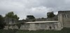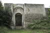 Extérieur de l’abbaye avec vue sur le cellier à gauche et les restes de la salle capitulaire au centre. Un plan est cloué devant l’entée de l’armarium-sacristie.