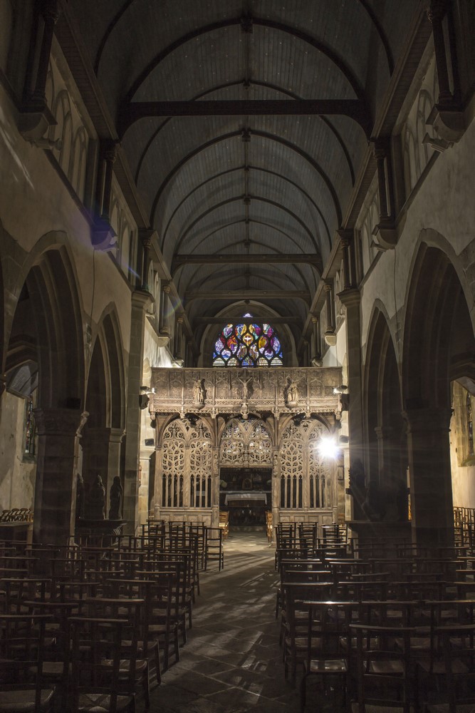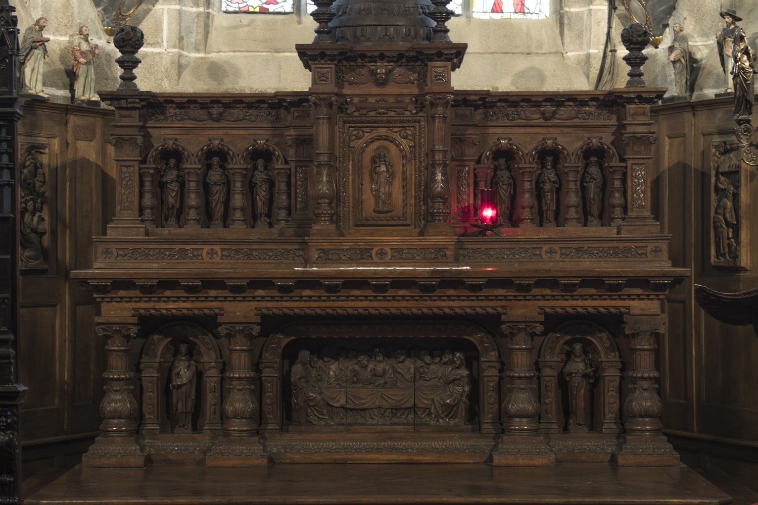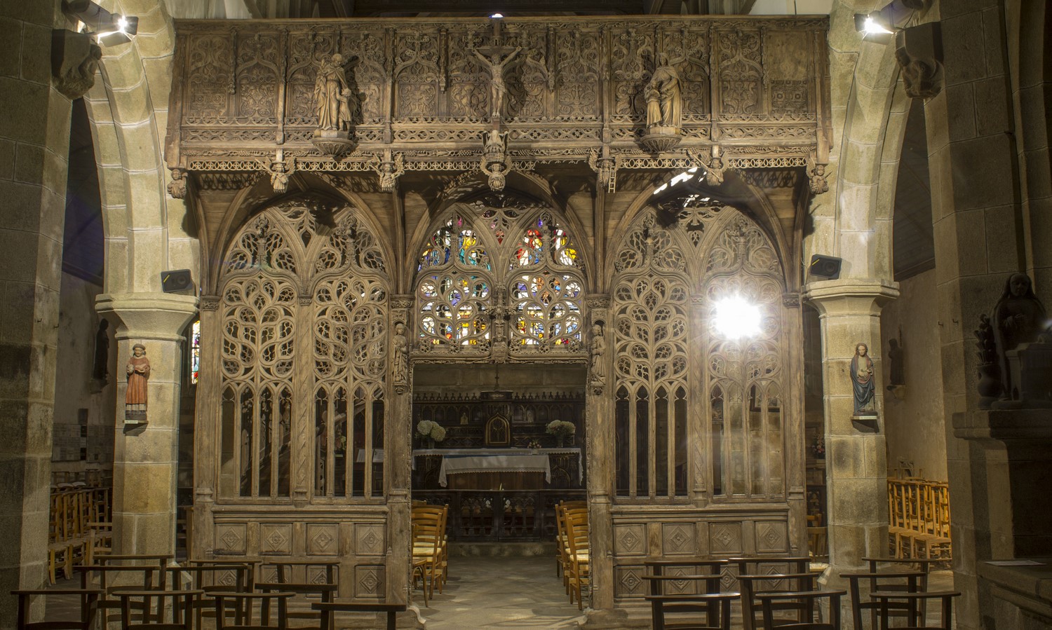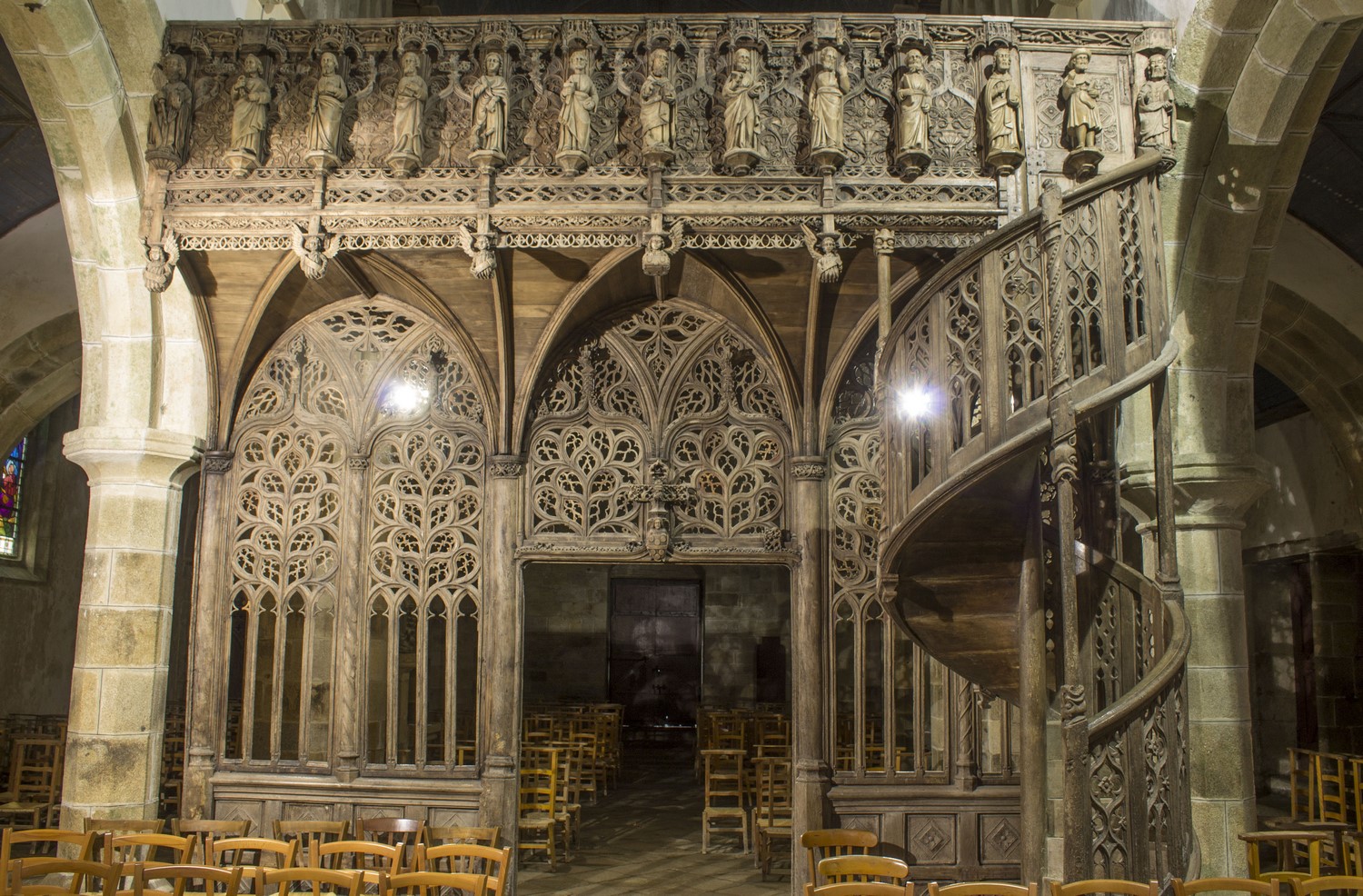 ► Un jubé de f.XV ou d.XVI est aujourd’hui encore visible devant le chœur. C’est une œuvre en bois de chêne sculptée dans un style gothique flamboyant tardif. On devine les premières influence de l’art renaissant italien, notamment sur les bas reliefs des panneaux. Les statues sont pour la plupart de facture récente, de la main du sculpteur Louis Derrien. Vers le chœur repose les douze Apôtres plus saint Roch.
