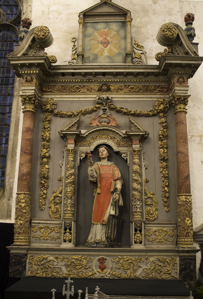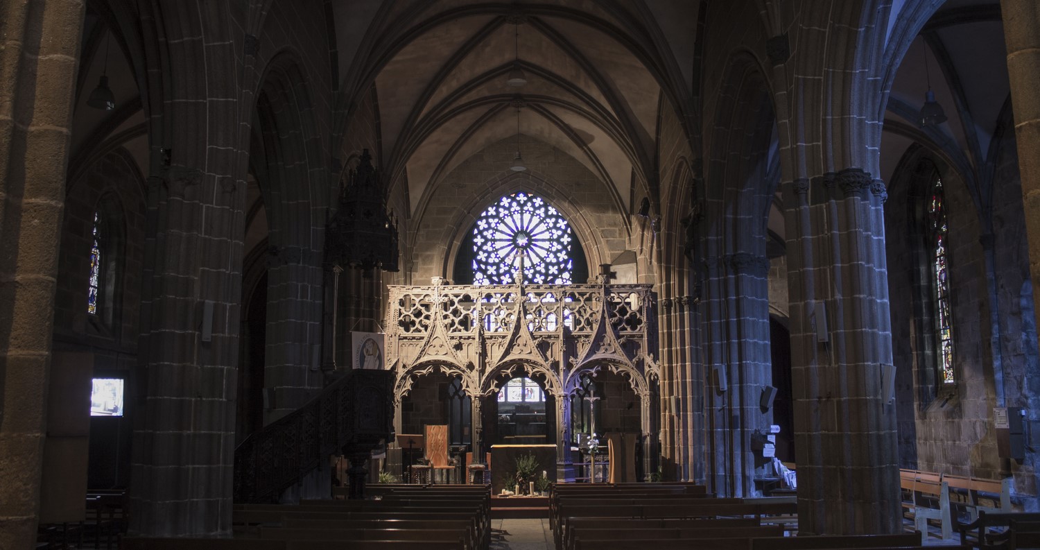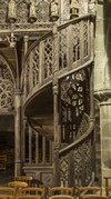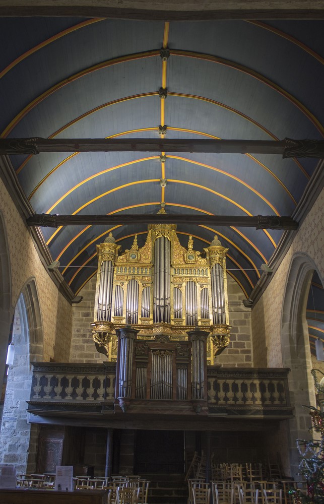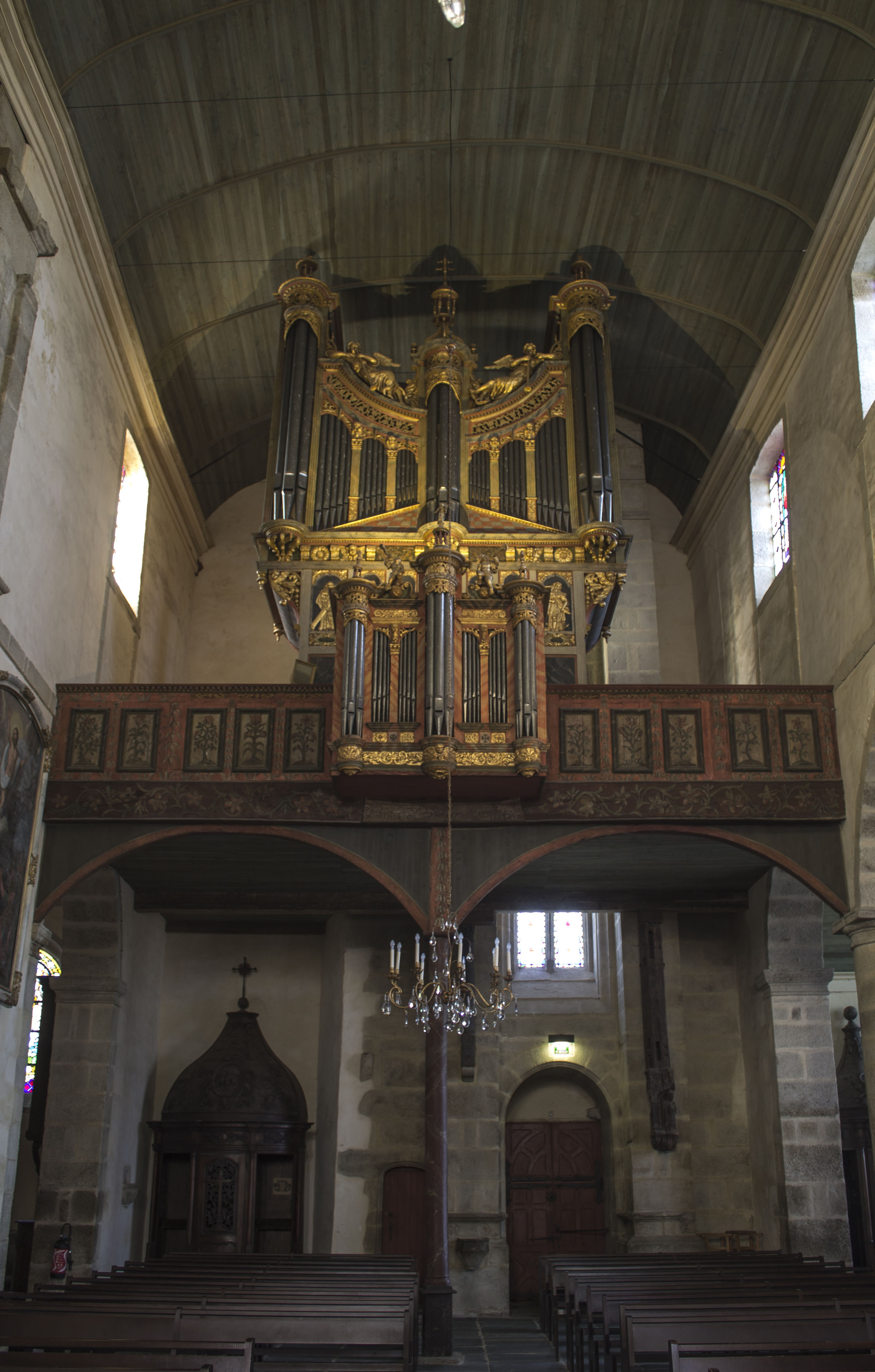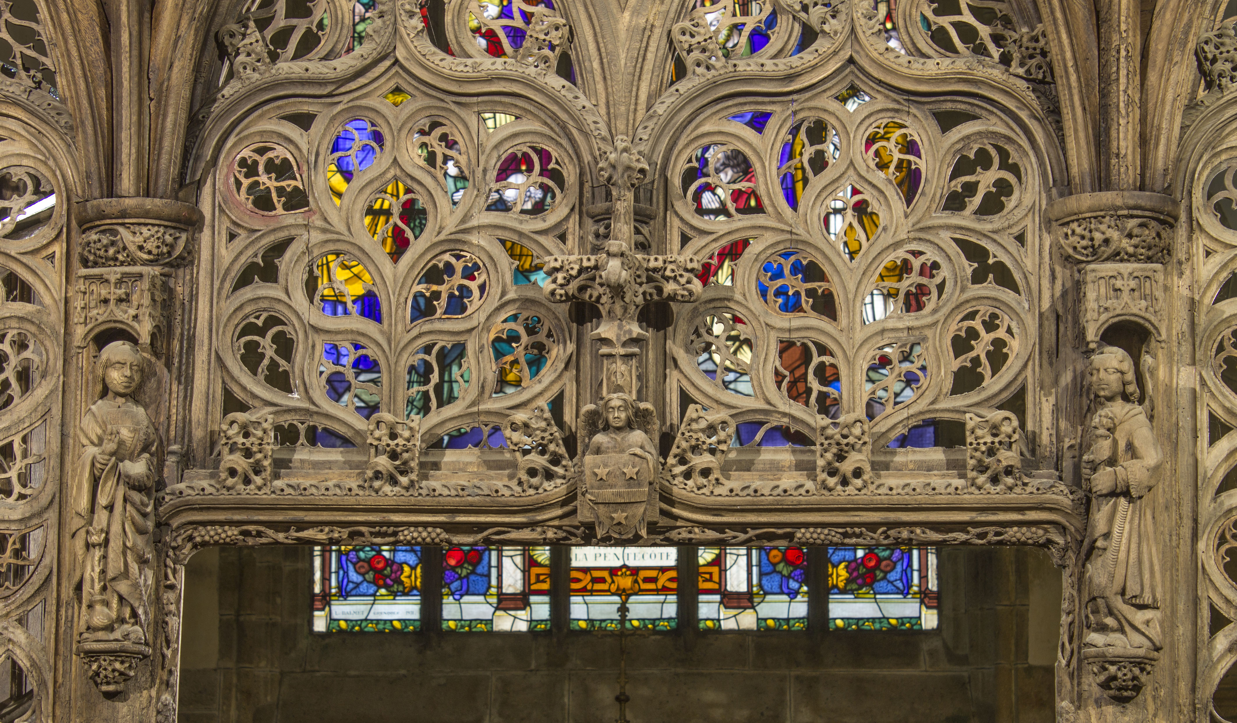 ► Un jubé de f.XV ou d.XVI est aujourd’hui encore visible devant le chœur. C’est une œuvre en bois de chêne sculptée dans un style gothique flamboyant tardif. On devine les premières influence de l’art renaissant italien, notamment sur les bas reliefs des panneaux. Les statues sont pour la plupart de facture récente, de la main du sculpteur Louis Derrien. Vers le chœur repose les douze Apôtres plus saint Roch.