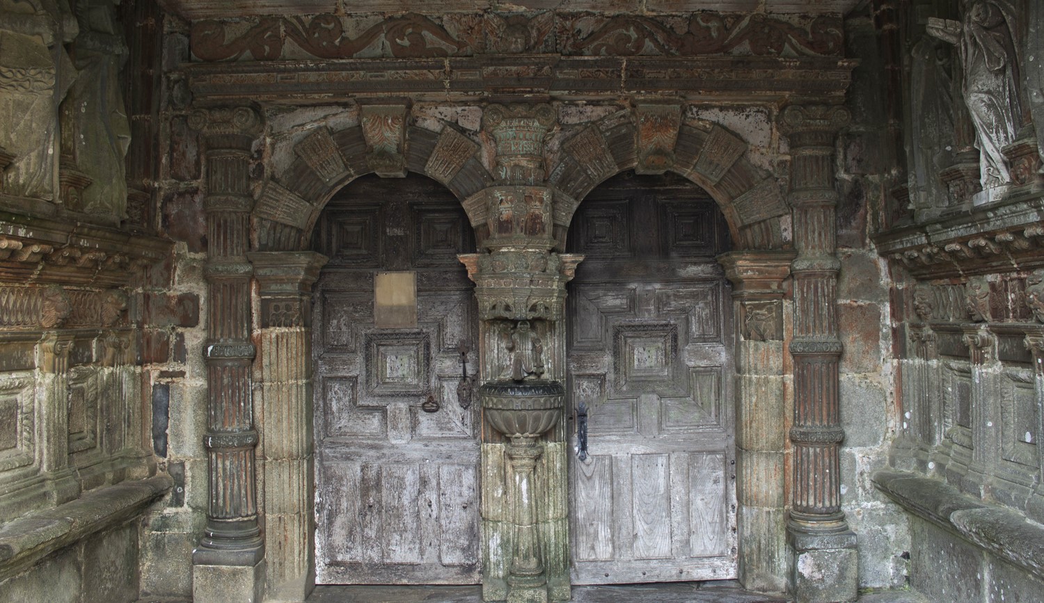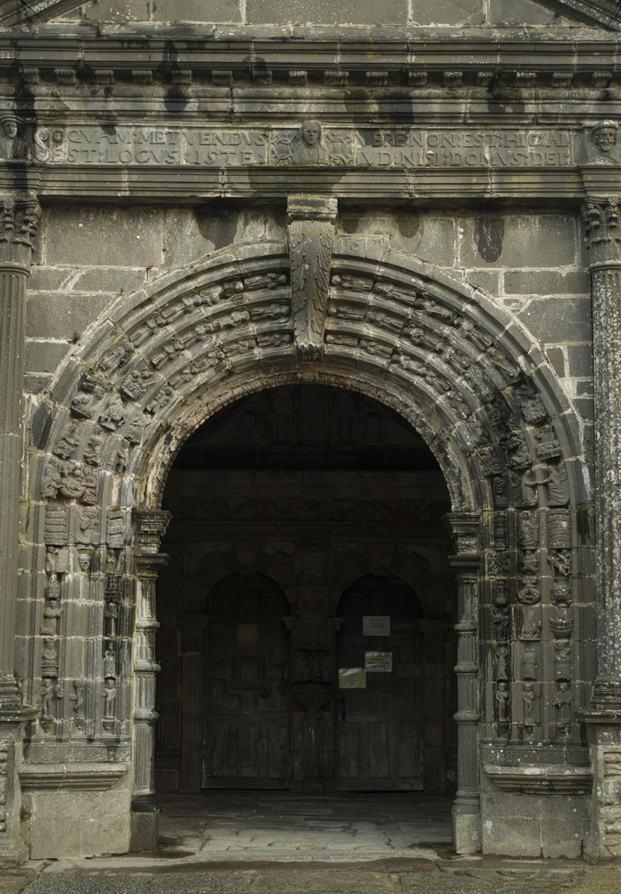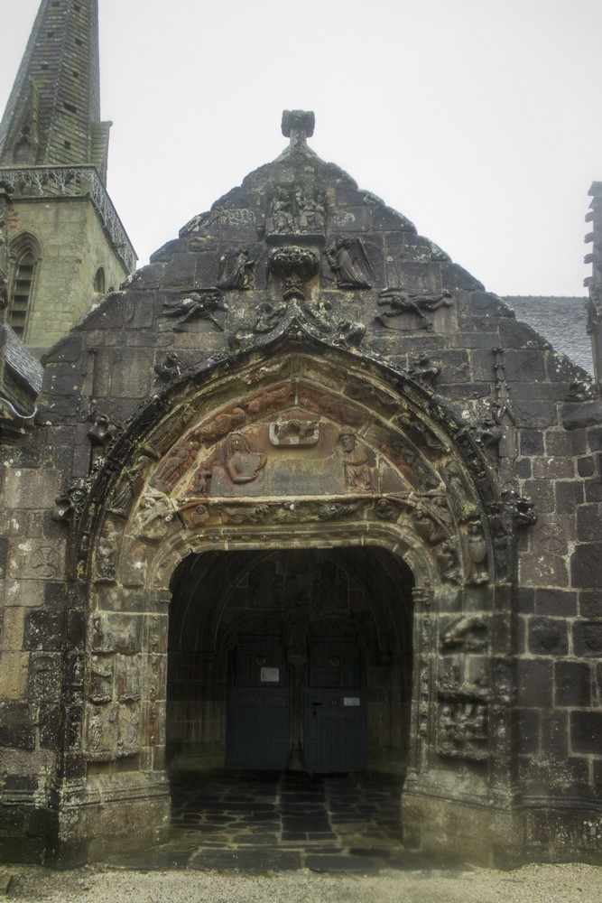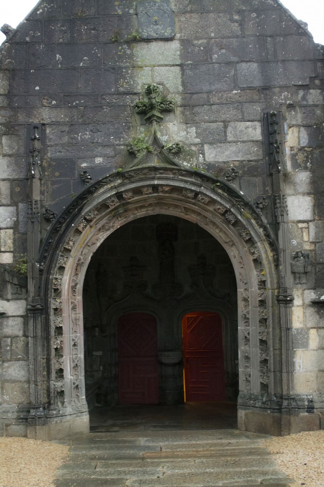 ► Le porche de Notre-Dame, daté de 1553 et entièrement sculpté dans du granite de Kersanton, est doté de voussures aux multiples saint et de riches symboles. Il porte une inscription en gothique : Le 15e jour de mars l’an 1553, fut fondé ceste chapelle au nom de Dieu et de sa mère et madame saincte Apoline de par Hervé Kerahes et Guillaume Bras fabriques de la dite chapel.