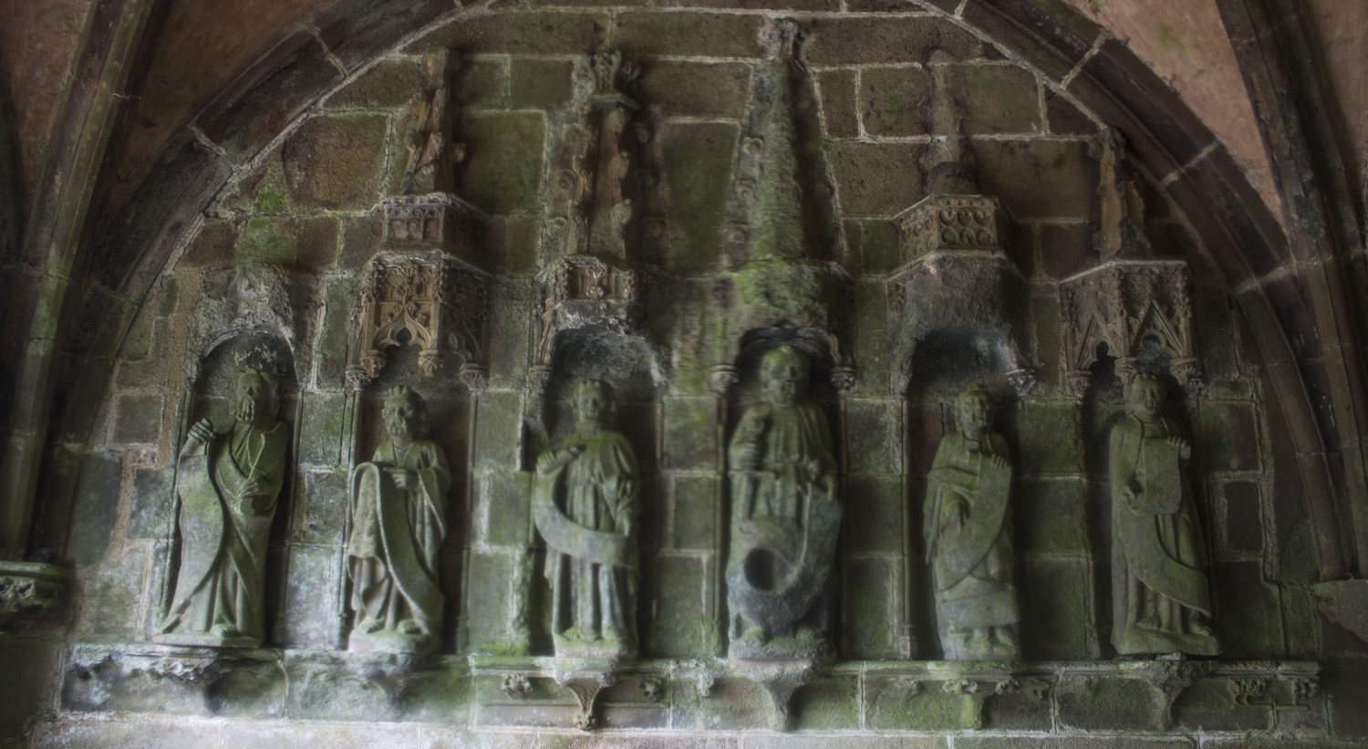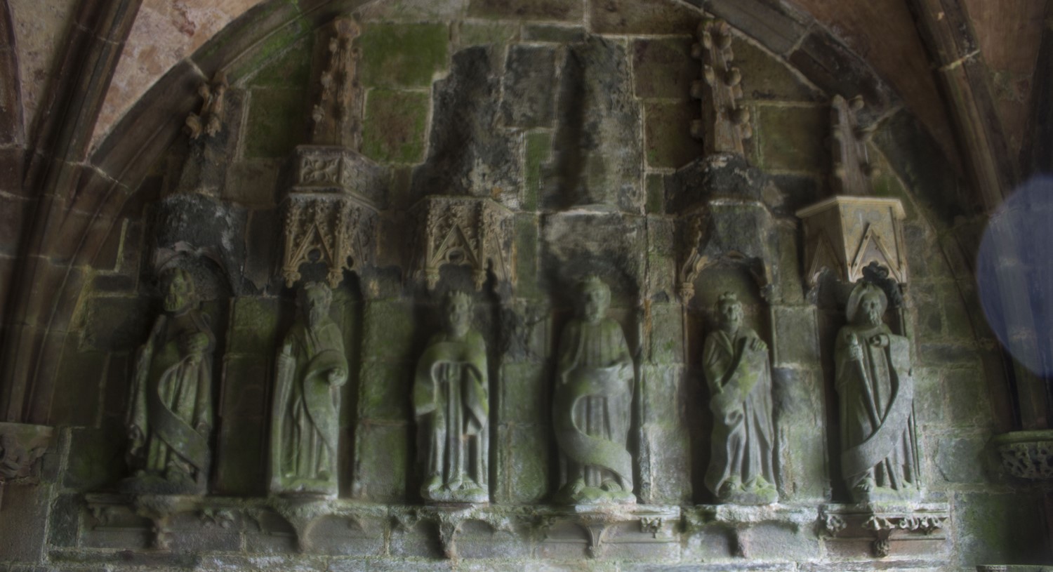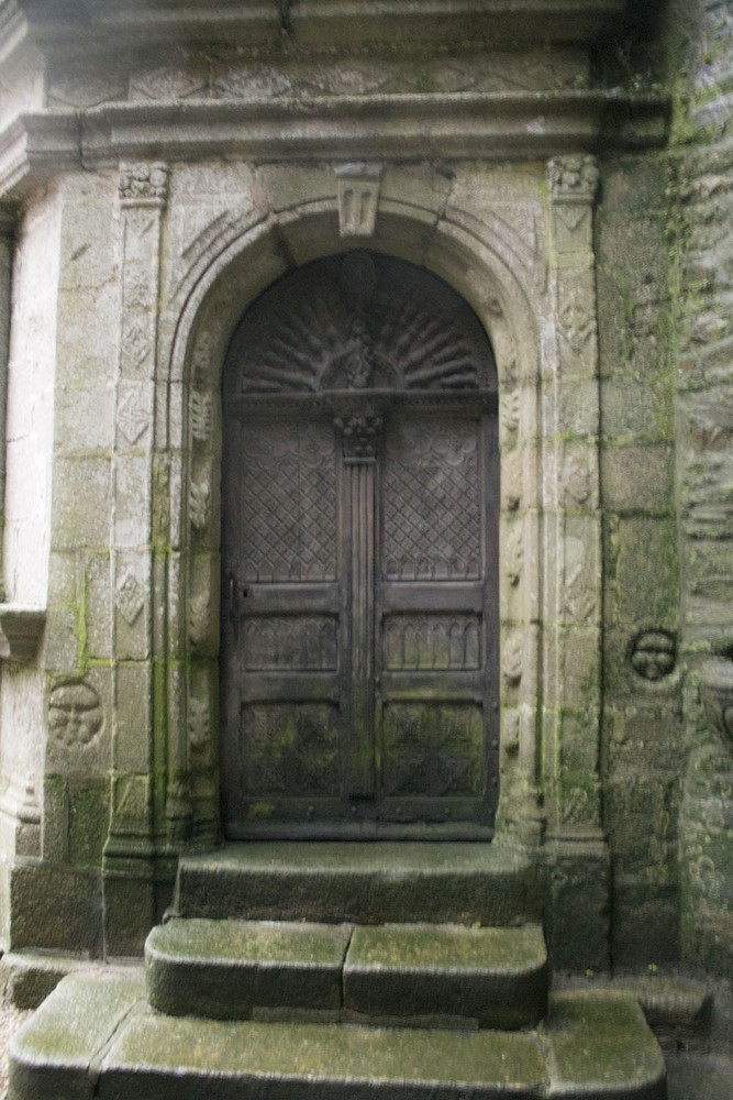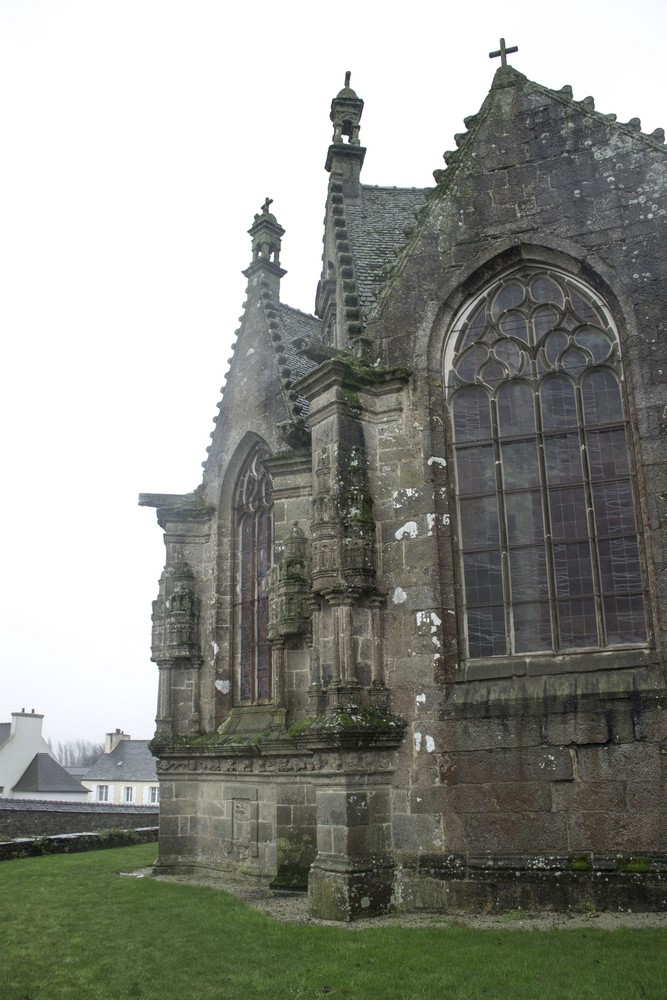 ► Le porche de Notre-Dame, daté de 1553 et entièrement sculpté dans du granite de Kersanton, est doté de voussures aux multiples saint et de riches symboles. Il porte une inscription en gothique : Le 15e jour de mars l’an 1553, fut fondé ceste chapelle au nom de Dieu et de sa mère et madame saincte Apoline de par Hervé Kerahes et Guillaume Bras fabriques de la dite chapel.