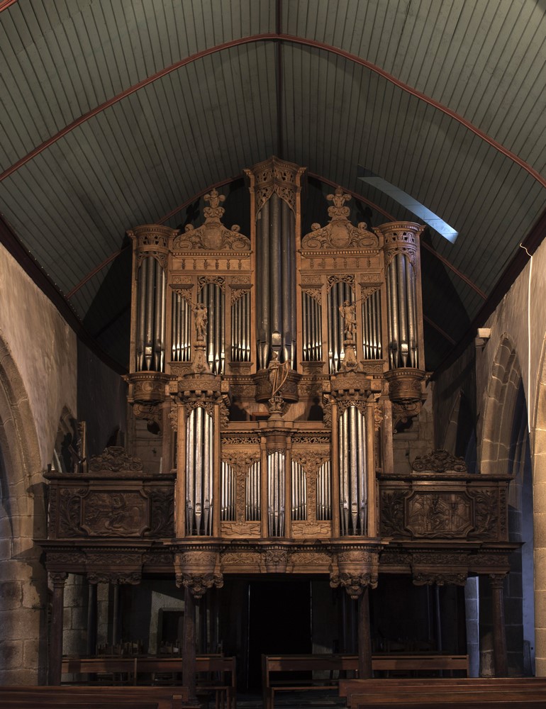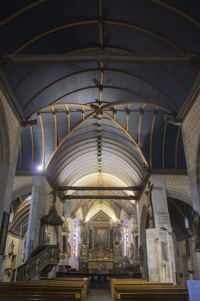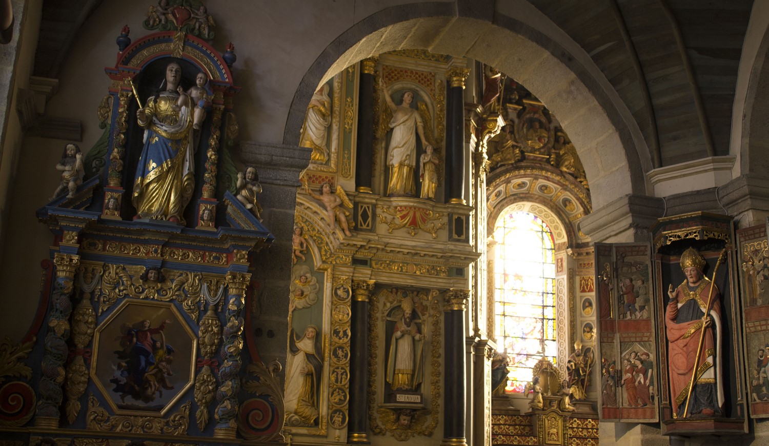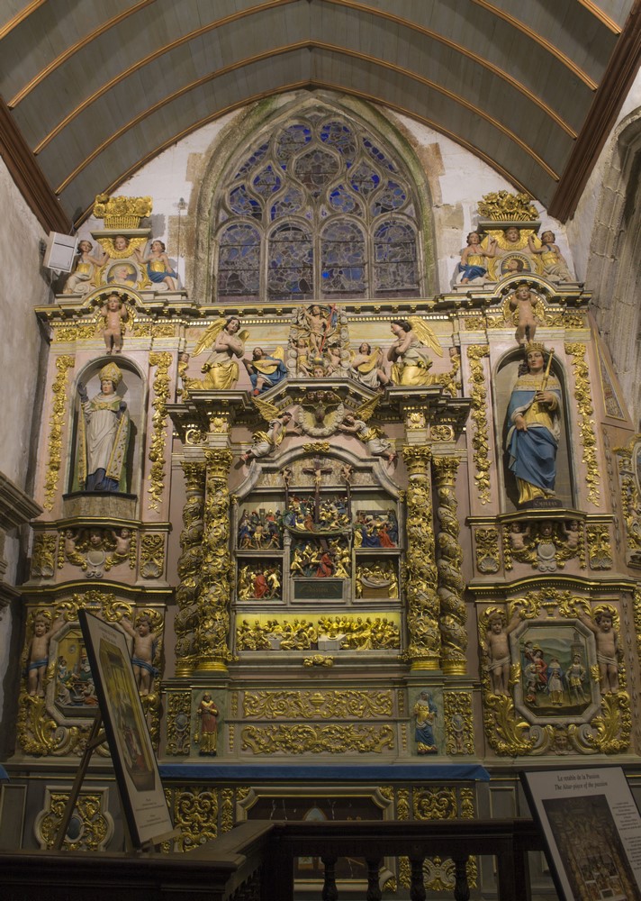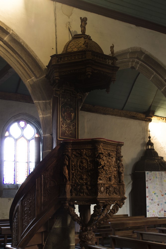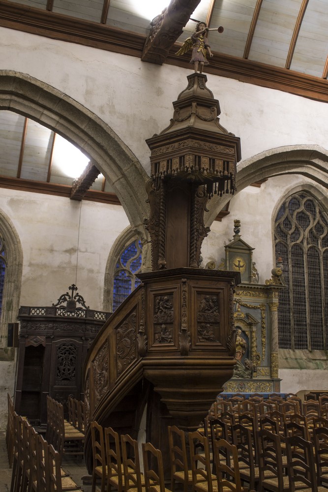 ► L’église a vu sa nef et son chœur s’habiller au XVII de nombreux retables en bois du style baroque bretonnant. Le XVII fut une période faste pour l’expansion de la foi chrétienne dans la région, en particulier grâce à l’activité de Julien Maunoir et de Michel le Nobletz qui inventa l’usage de dessins à symbolique chrétienne nommés en breton "taolennoù" ou tableaux de mission. Les stalles sculptées de démons aquatiques rappellent l’affinité de la culture bretonne avec cette élément.